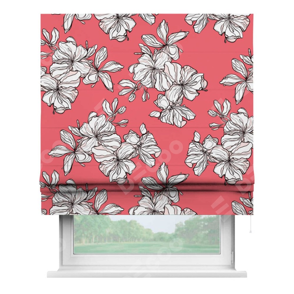 Римская штора производителя «Cortin», используется для проёма, пошита из ткани блэкаут с нанесением сублимационной печати «Белые цветы». Имеет универсальный механизм и подходит для монтажа: на потолок, на стену и в нишу.