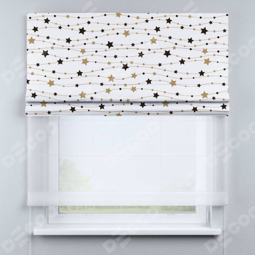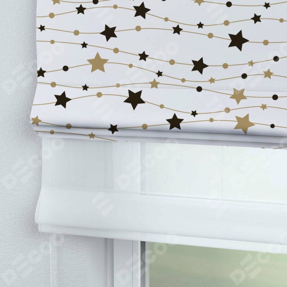 Римская штора «Кортин» день-ночь «Звёздная нить» доступна к заказу по любым размерам. Её артикул: 19120. Стоимость пошива будет зависеть от выбранных опций и начинается от 5 300 руб. В интернет-магазине Decoo вы сможете выбрать товар в любых вариациях.