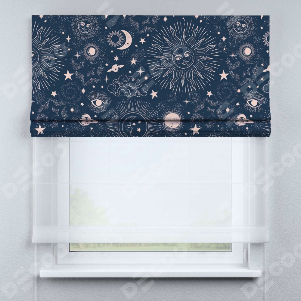 Римская штора день-ночь производителя «Cortin», используется для проёма, пошита из двух полотен, с лицевой блэкаут с нанесением сублимационной печати «Звёзды и планеты», вторая ткань тюль (по стандарту комплектуется тюль белого цвета артикул V-01). Имеет универсальный механизм и подходит для монтажа: на потолок, на стену и в нишу.