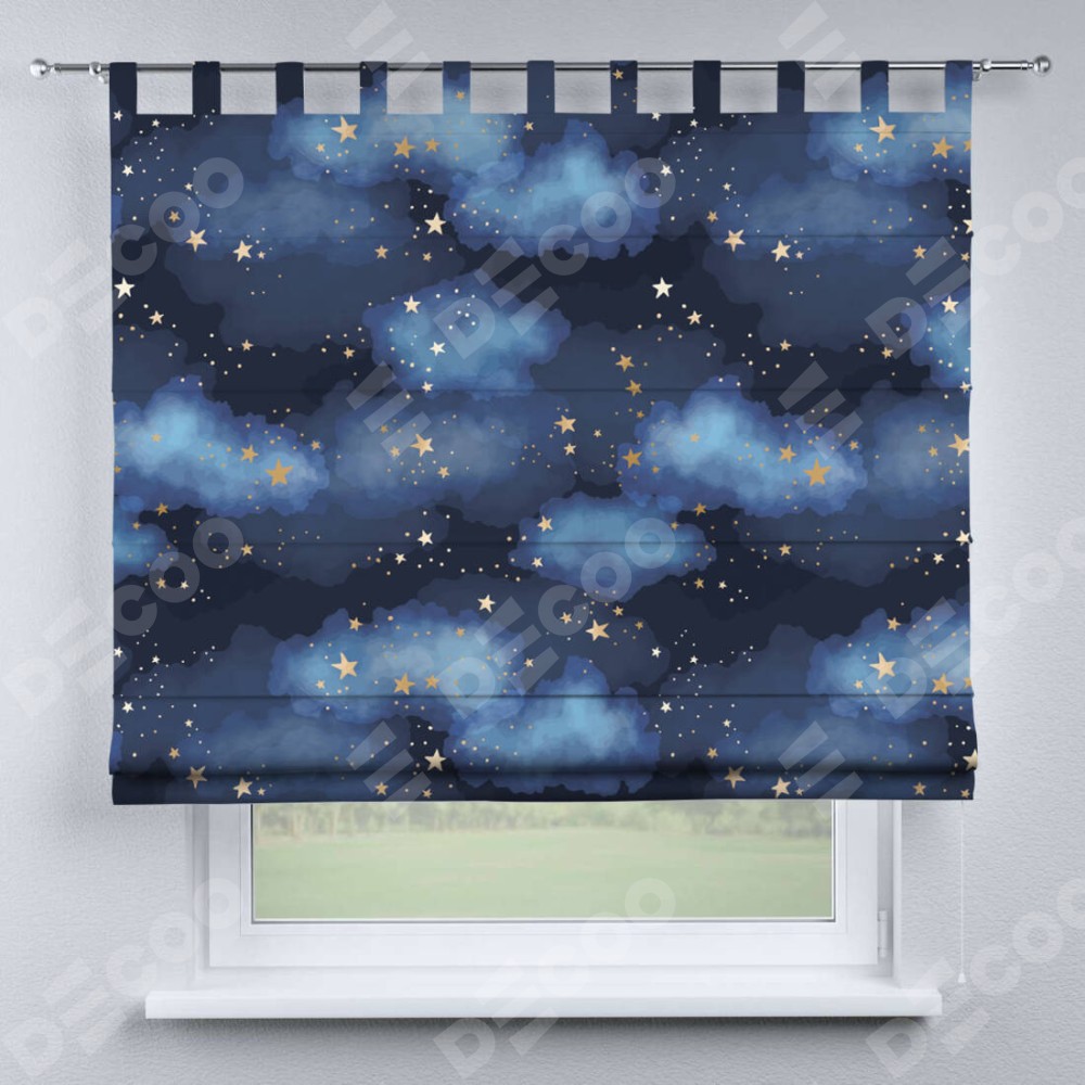 Римская штора производителя «Cortin», используется для проёма, пошита из ткани блэкаут с нанесением сублимационной печати «Золотые звёзды». Данная модель пошита на петлях, комплектуется на выбор круглым карнизом и подходит для монтажа на стену. Римская штора на петлях имеет простую систему регулировки высоты, отличительным преимуществом данной модели является простой способ монтажа. Достаточно повесить ее на трубу и штора готова!
