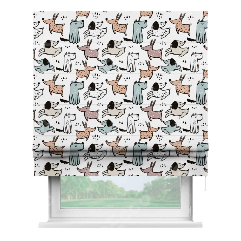 Римская штора производителя «Cortin», используется для проёма, пошита из ткани блэкаут с нанесением сублимационной печати «Очаровательные щеночки». Имеет универсальный механизм и подходит для монтажа: на потолок, на стену и в нишу.