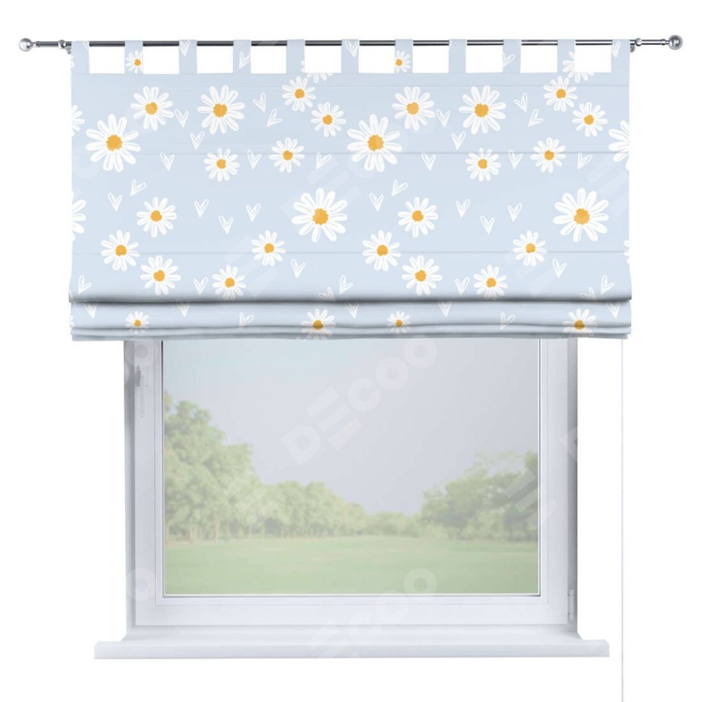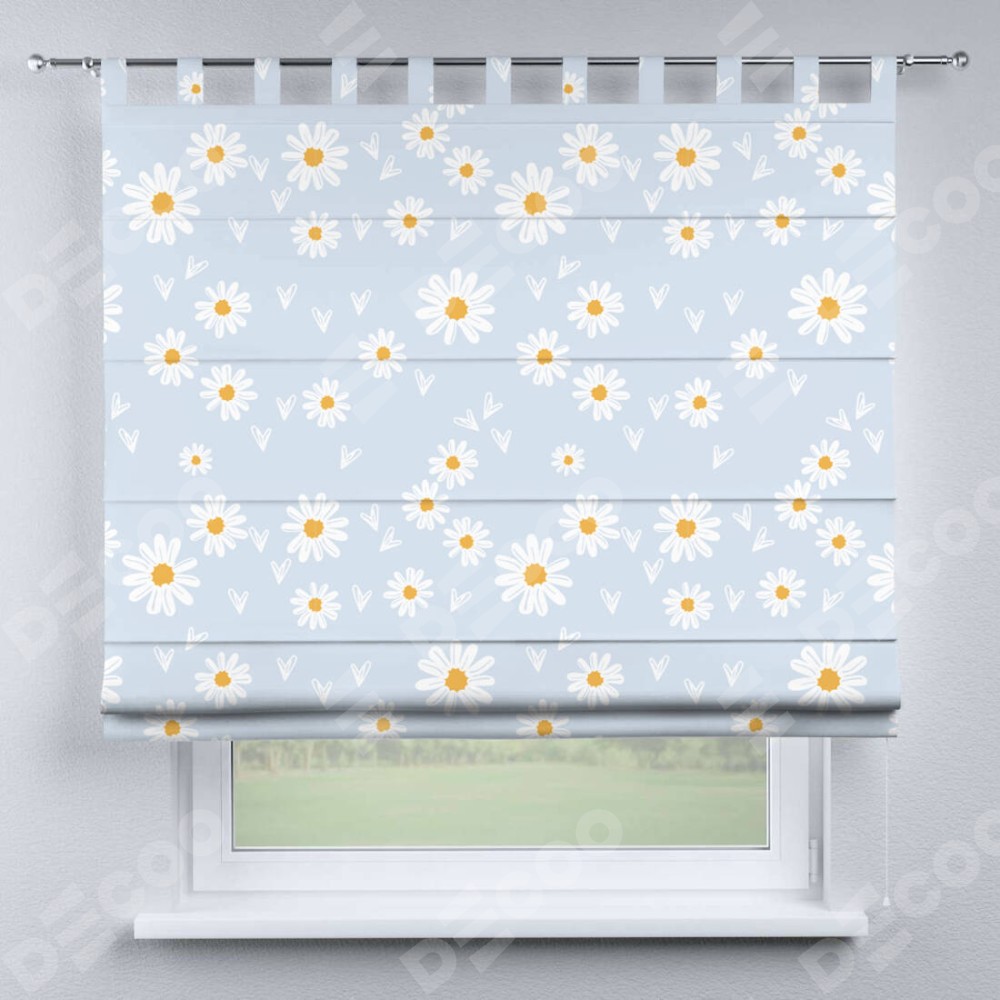 Римская штора производителя «Cortin», используется для проёма, пошита из ткани блэкаут с нанесением сублимационной печати «Летние ромашки». Данная модель пошита на петлях, комплектуется на выбор круглым карнизом и подходит для монтажа на стену. Римская штора на петлях имеет простую систему регулировки высоты, отличительным преимуществом данной модели является простой способ монтажа. Достаточно повесить ее на трубу и штора готова!