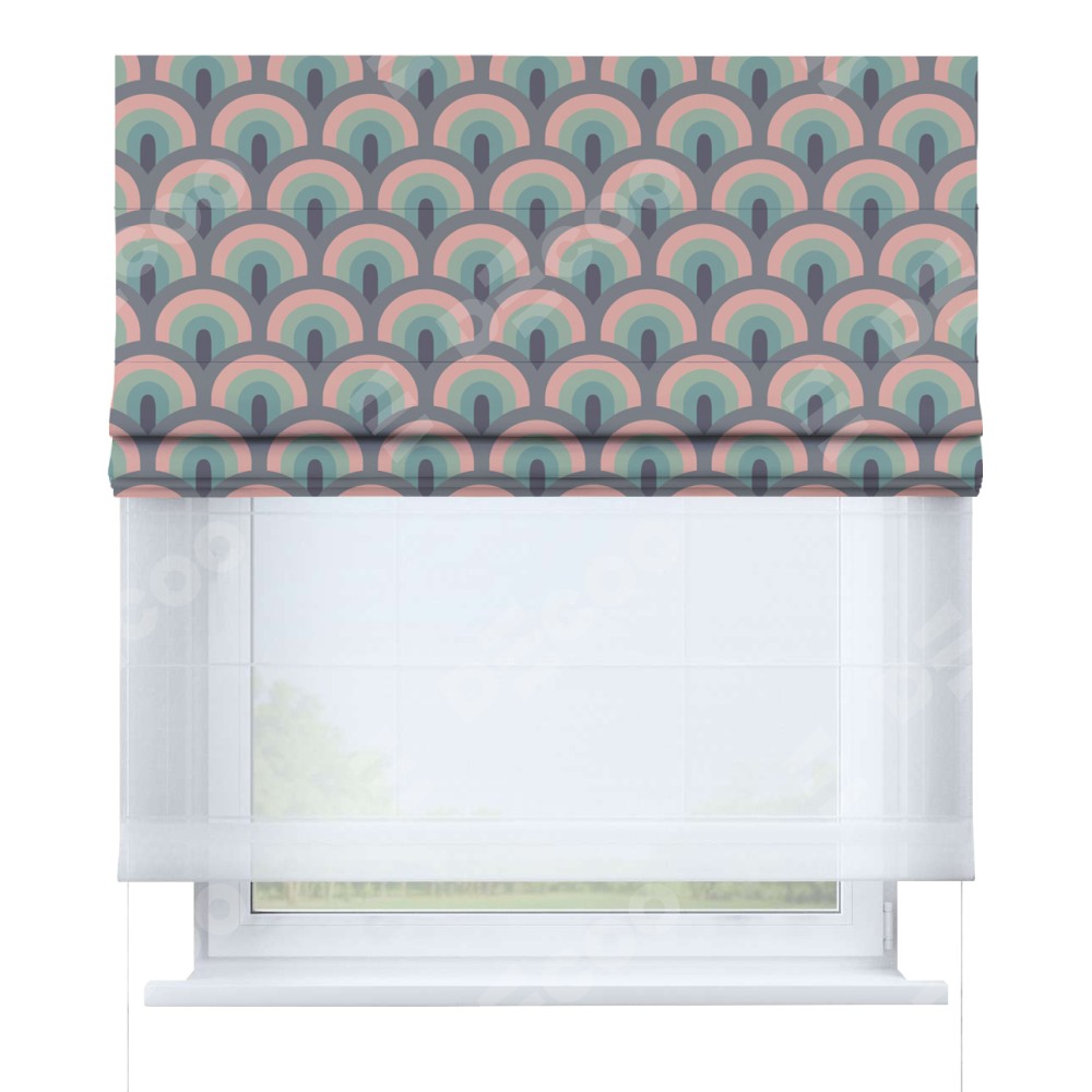 Римская штора день-ночь производителя «Cortin», используется для проёма, пошита из двух полотен, с лицевой блэкаут с нанесением сублимационной печати «Ретро орнамент», вторая ткань тюль (по стандарту комплектуется тюль белого цвета артикул V-01). Имеет универсальный механизм и подходит для монтажа: на потолок, на стену и в нишу.