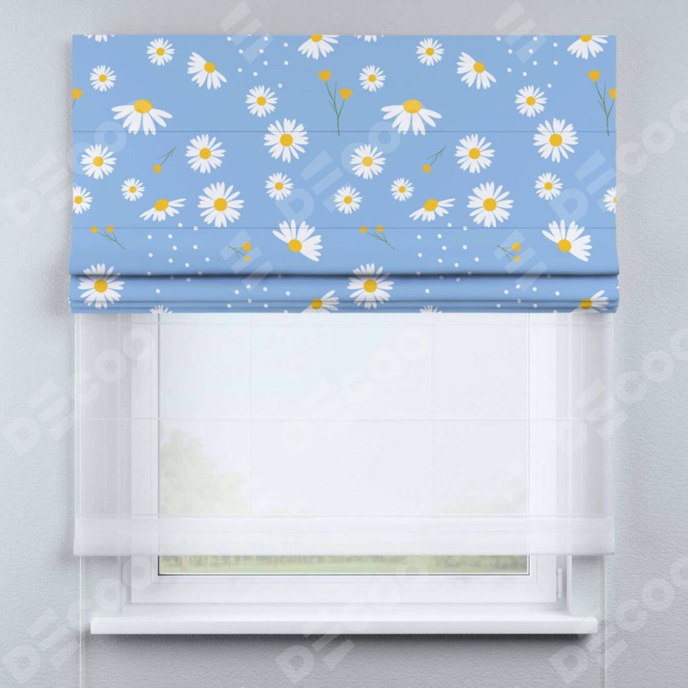 Римская штора день-ночь производителя «Cortin», используется для проёма, пошита из двух полотен, с лицевой блэкаут с нанесением сублимационной печати «Ромашки на голубом», вторая ткань тюль (по стандарту комплектуется тюль белого цвета артикул V-01). Имеет универсальный механизм и подходит для монтажа: на потолок, на стену и в нишу.