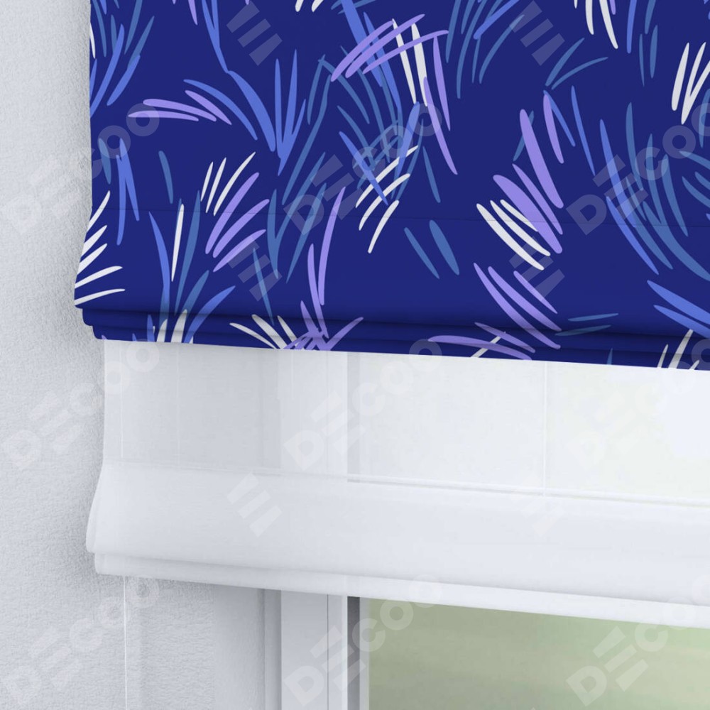 Римская штора день-ночь производителя «Cortin», используется для проёма, пошита из двух полотен, с лицевой блэкаут с нанесением сублимационной печати «Синяя абстракция», вторая ткань тюль (по стандарту комплектуется тюль белого цвета артикул V-01). Имеет универсальный механизм и подходит для монтажа: на потолок, на стену и в нишу.
