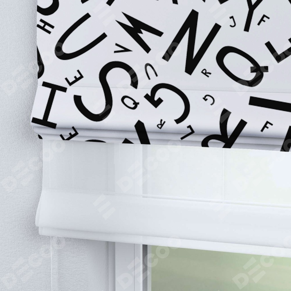 Римская штора день-ночь производителя «Cortin», используется для проёма, пошита из двух полотен, с лицевой блэкаут с нанесением сублимационной печати «Литеры на белом», вторая ткань тюль (по стандарту комплектуется тюль белого цвета артикул V-01). Имеет универсальный механизм и подходит для монтажа: на потолок, на стену и в нишу.