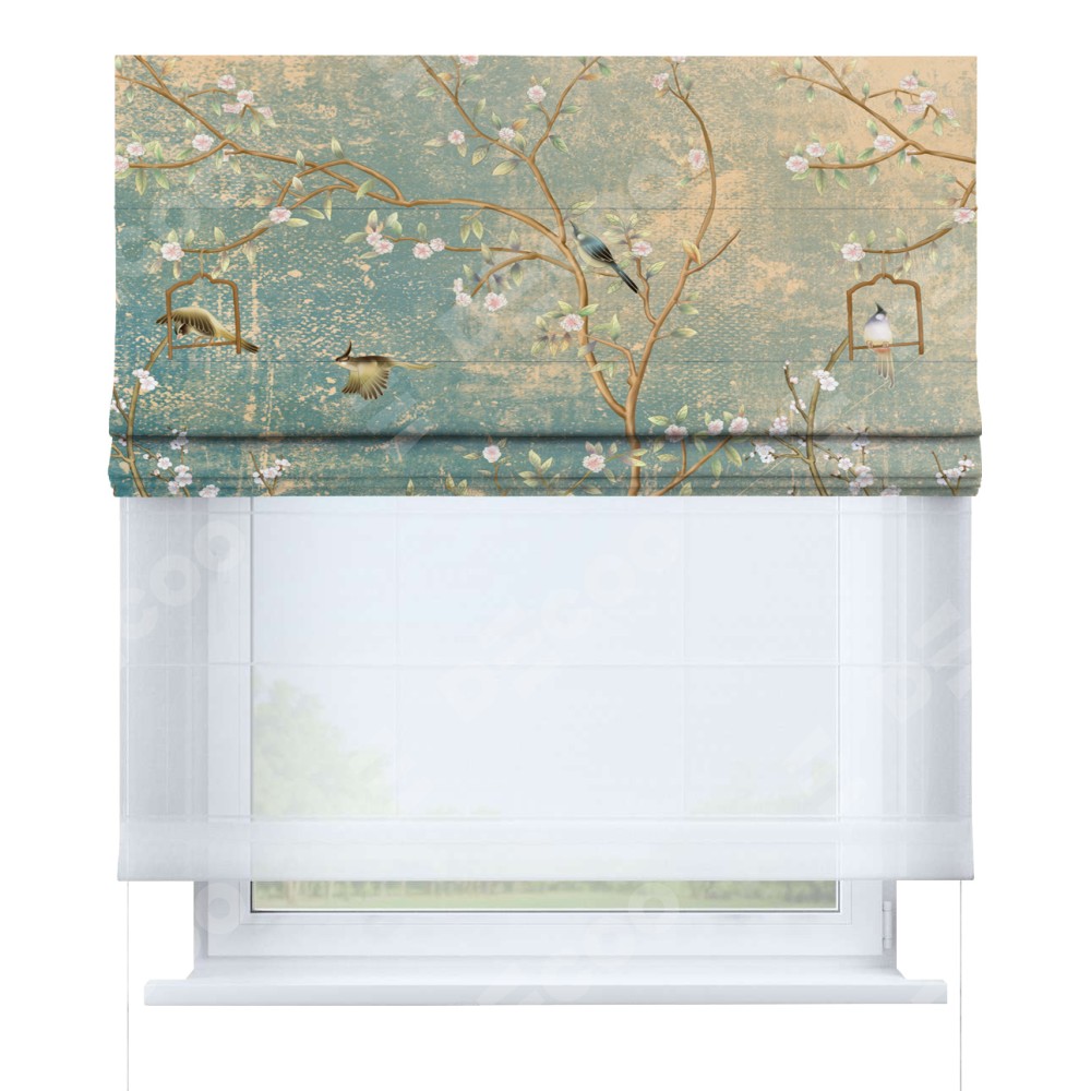 Римская штора день-ночь производителя «Cortin», используется для проёма, пошита из двух полотен, с лицевой блэкаут с нанесением сублимационной печати «Цветущий сад», вторая ткань тюль (по стандарту комплектуется тюль белого цвета артикул V-01). Имеет универсальный механизм и подходит для монтажа: на потолок, на стену и в нишу.