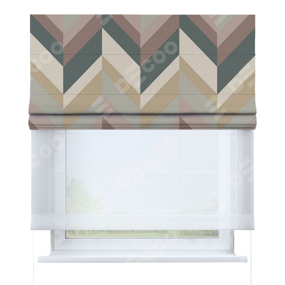 Римская штора день-ночь производителя «Cortin», используется для проёма, пошита из двух полотен, с лицевой блэкаут с нанесением сублимационной печати «Шеврон Авеню», вторая ткань тюль (по стандарту комплектуется тюль белого цвета артикул V-01). Имеет универсальный механизм и подходит для монтажа: на потолок, на стену и в нишу.