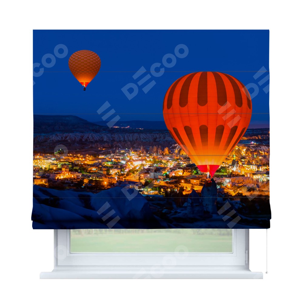 Римская штора производителя «Cortin», используется для проёма, пошита из ткани блэкаут с нанесением сублимационной печати «Воздушные шары в небе». Имеет универсальный механизм и подходит для монтажа: на потолок, на стену и в нишу.