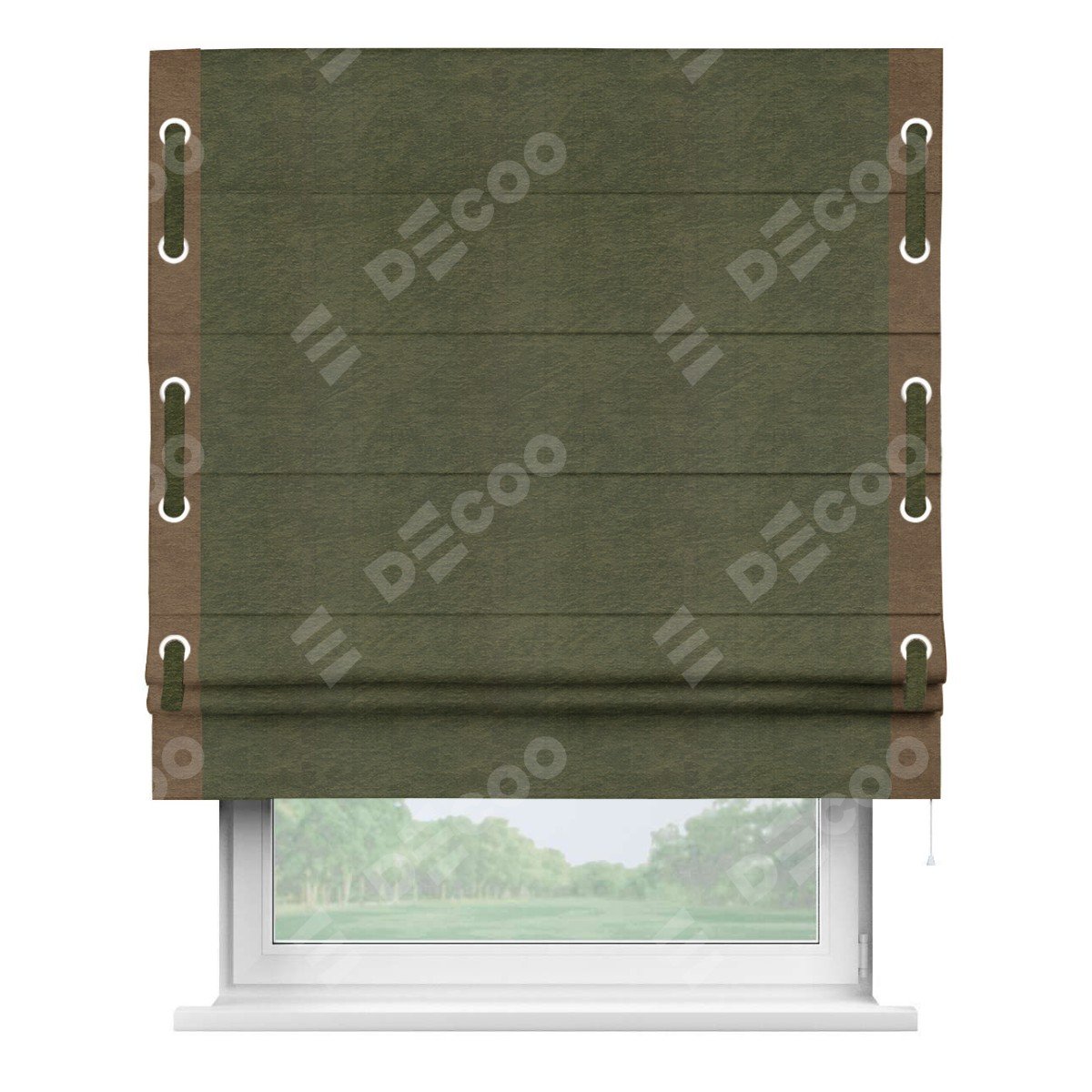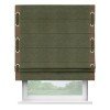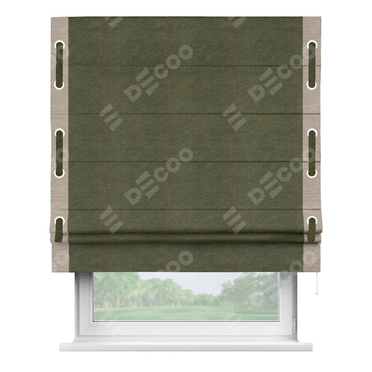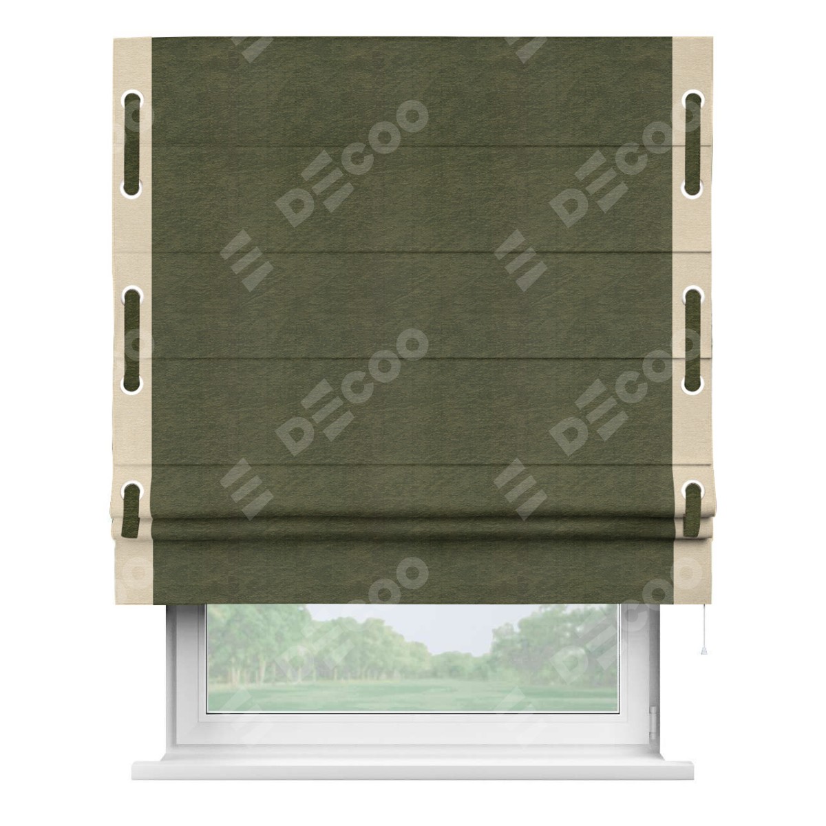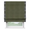 Римская штора производителя «Cortin», используется для проёма, пошита из ткани софт однотонный зелёный, артикул 33110. Отделка шторы кантом «Стрим Дуо» на кантах расположены люверсы с пояском, ткань для канта используется из софта разной расцветки на выбор. Ткань для пояска обычно используется из основной ткани шторы, а так же можно сделать из любой расцветки по желанию. Имеет универсальный механизм и подходит для монтажа: на потолок, на стену и в нишу.