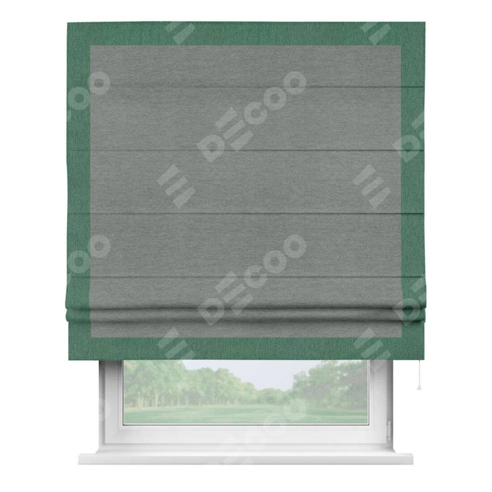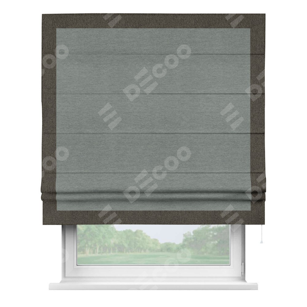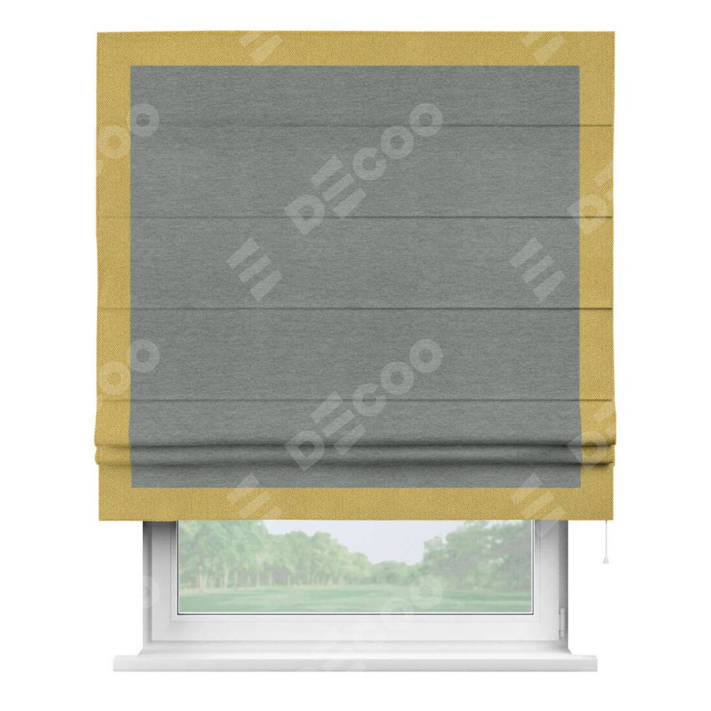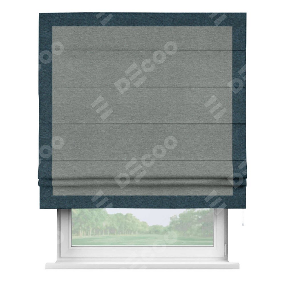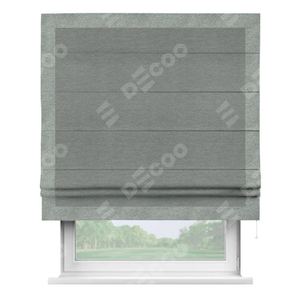 Римская штора производителя «Cortin», используется для проёма, пошита из ткани твид блэкаут серый, артикул 21577. Отделка шторы кантом «Чесс», ткань для канта используется из твида разной расцветки на выбор. Имеет универсальный механизм и подходит для монтажа: на потолок, на стену и в нишу.