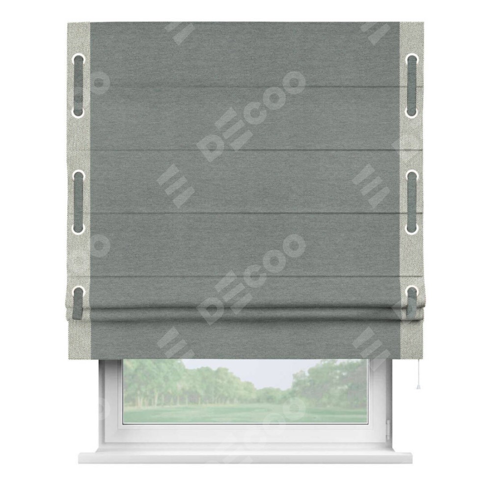 Римская штора производителя «Cortin», используется для проёма, пошита из ткани твид блэкаут серый, артикул 21577. Отделка шторы кантом «Стрим Дуо» на кантах расположены люверсы с пояском, ткань для канта используется из твида разной расцветки на выбор. Ткань для пояска обычно используется из основной ткани шторы, а так же можно сделать из любой расцветки по желанию. Имеет универсальный механизм и подходит для монтажа: на потолок, на стену и в нишу.