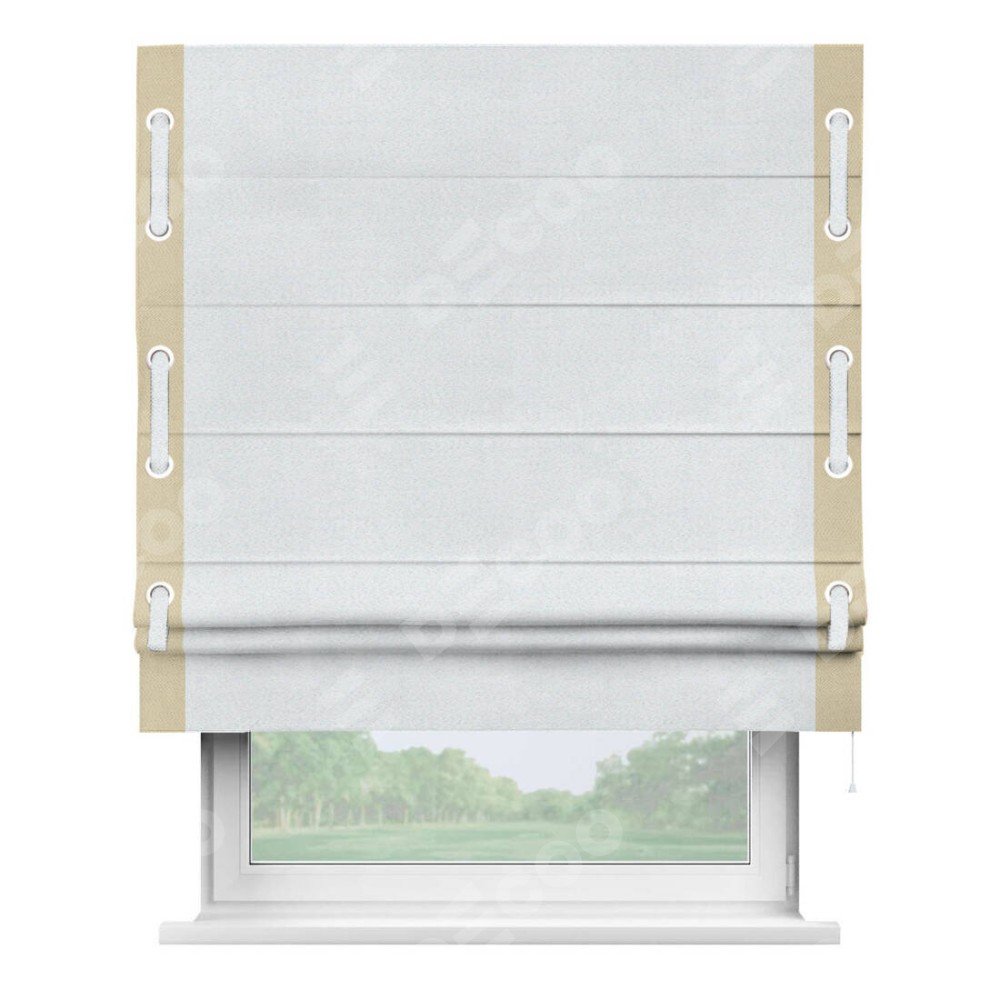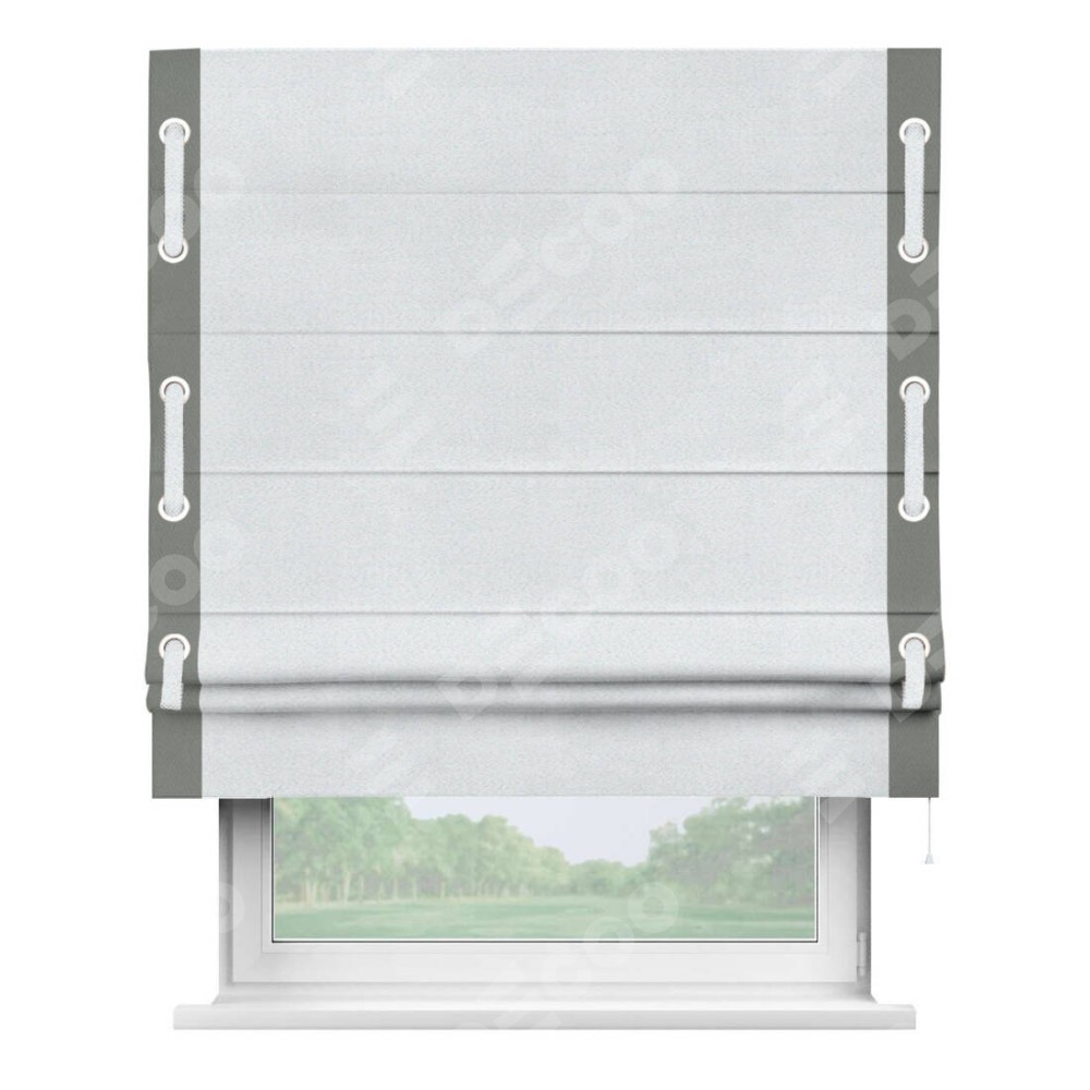 Римская штора производителя «Cortin», используется для проёма, пошита из ткани блэкаут однотонный дымчато-белый, артикул ткани 101. Отделка шторы кантом «Стрим Дуо» на кантах расположены люверсы с пояском, ткань для канта используется из блэкаута однотонного разной расцветки на выбор. Ткань для пояска обычно используется из основной ткани шторы, а так же можно сделать из любой расцветки по желанию. Имеет универсальный механизм и подходит для монтажа: на потолок, на стену и в нишу.