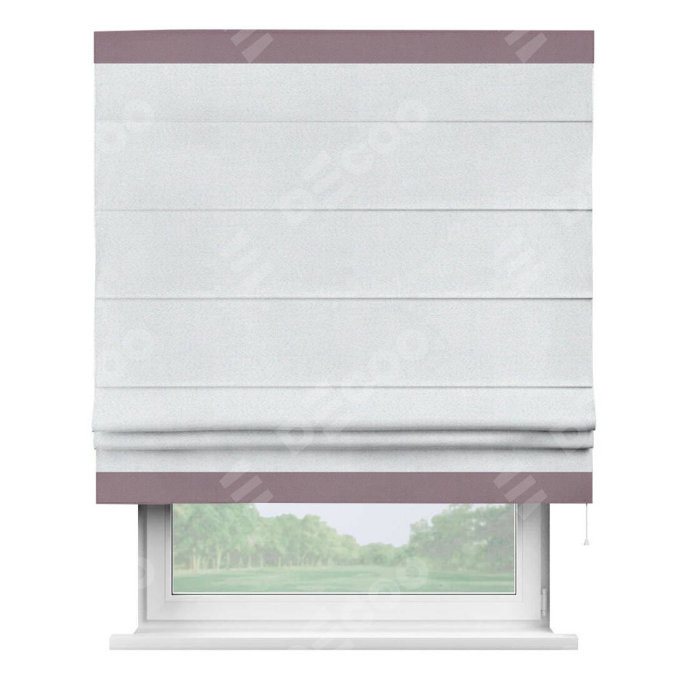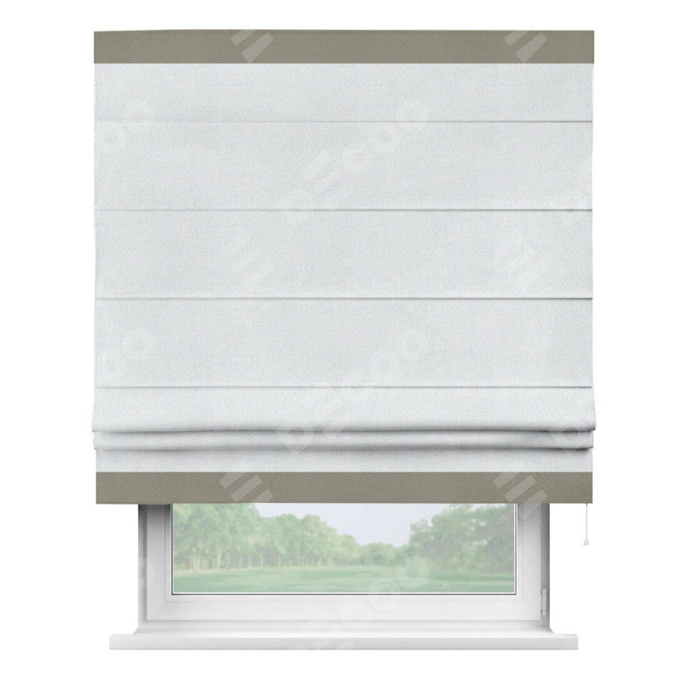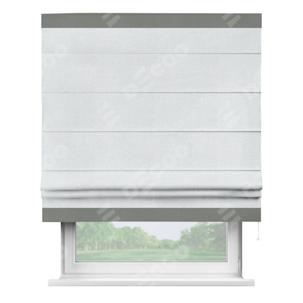Римская штора производителя «Cortin», используется для проёма, пошита из ткани блэкаут однотонный дымчато-белый, артикул ткани 101. Отделка шторы кантом «Горизонт», ткань для канта используется из блэкаута однотонного разной расцветки на выбор. Имеет универсальный механизм и подходит для монтажа: на потолок, на стену и в нишу.