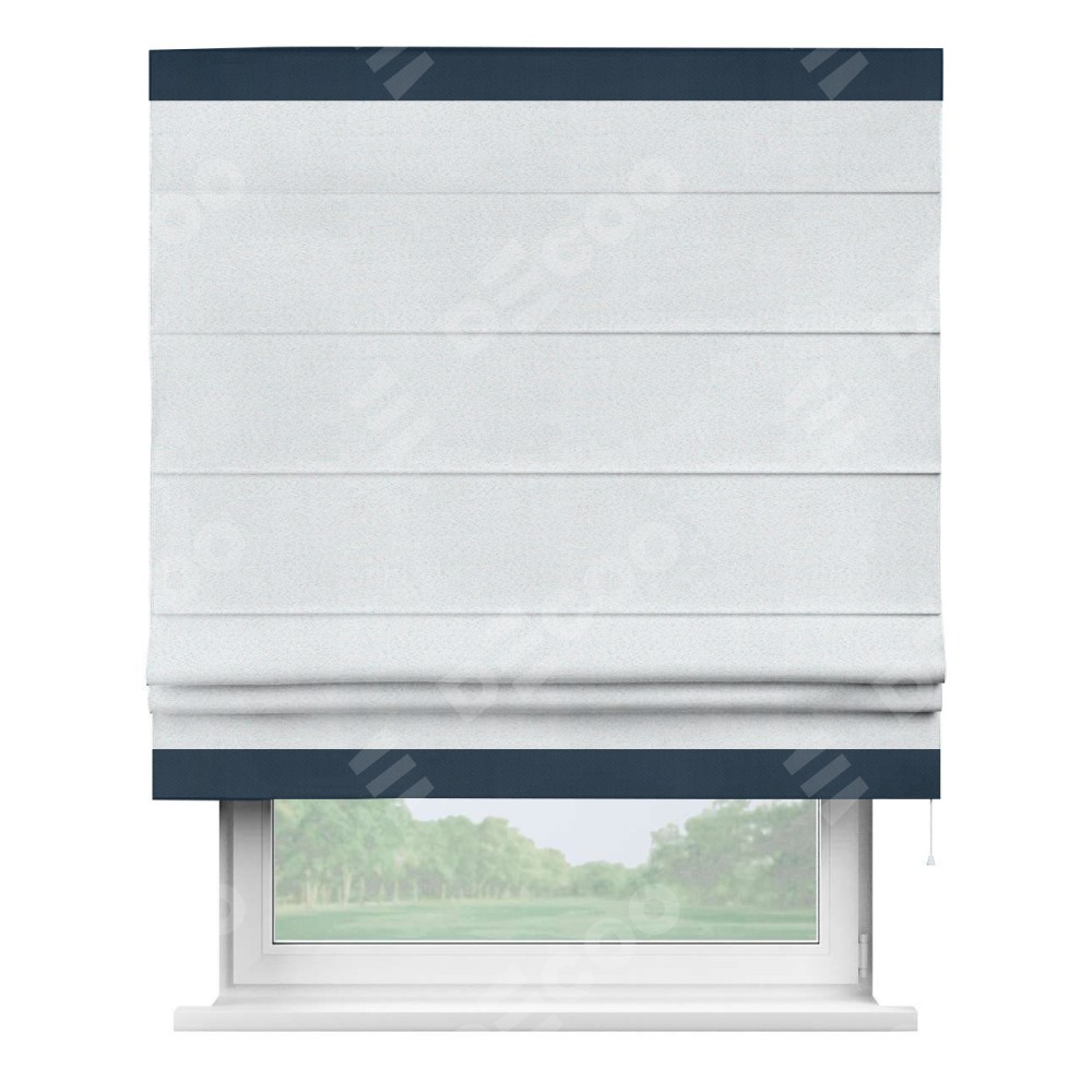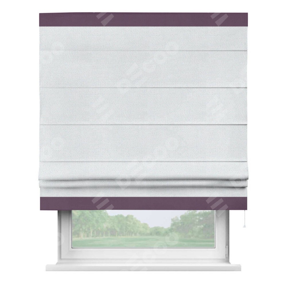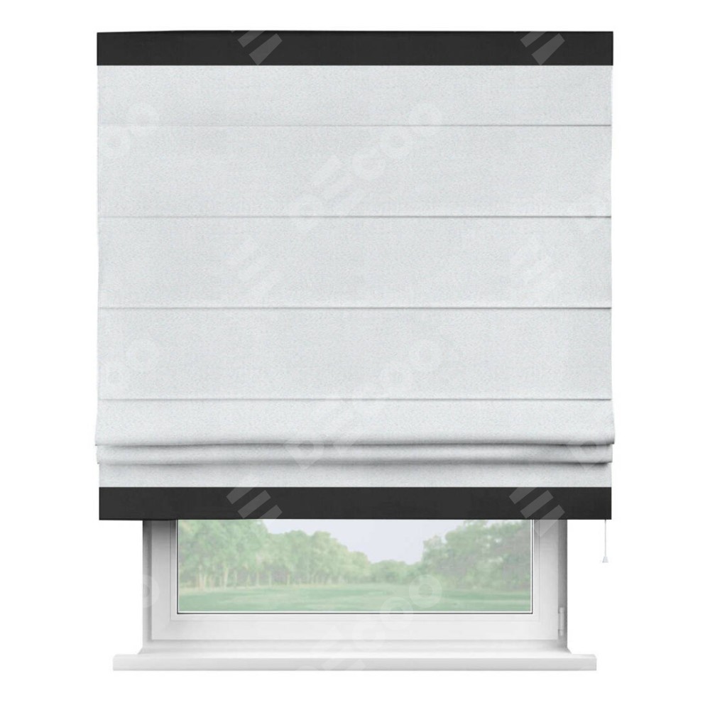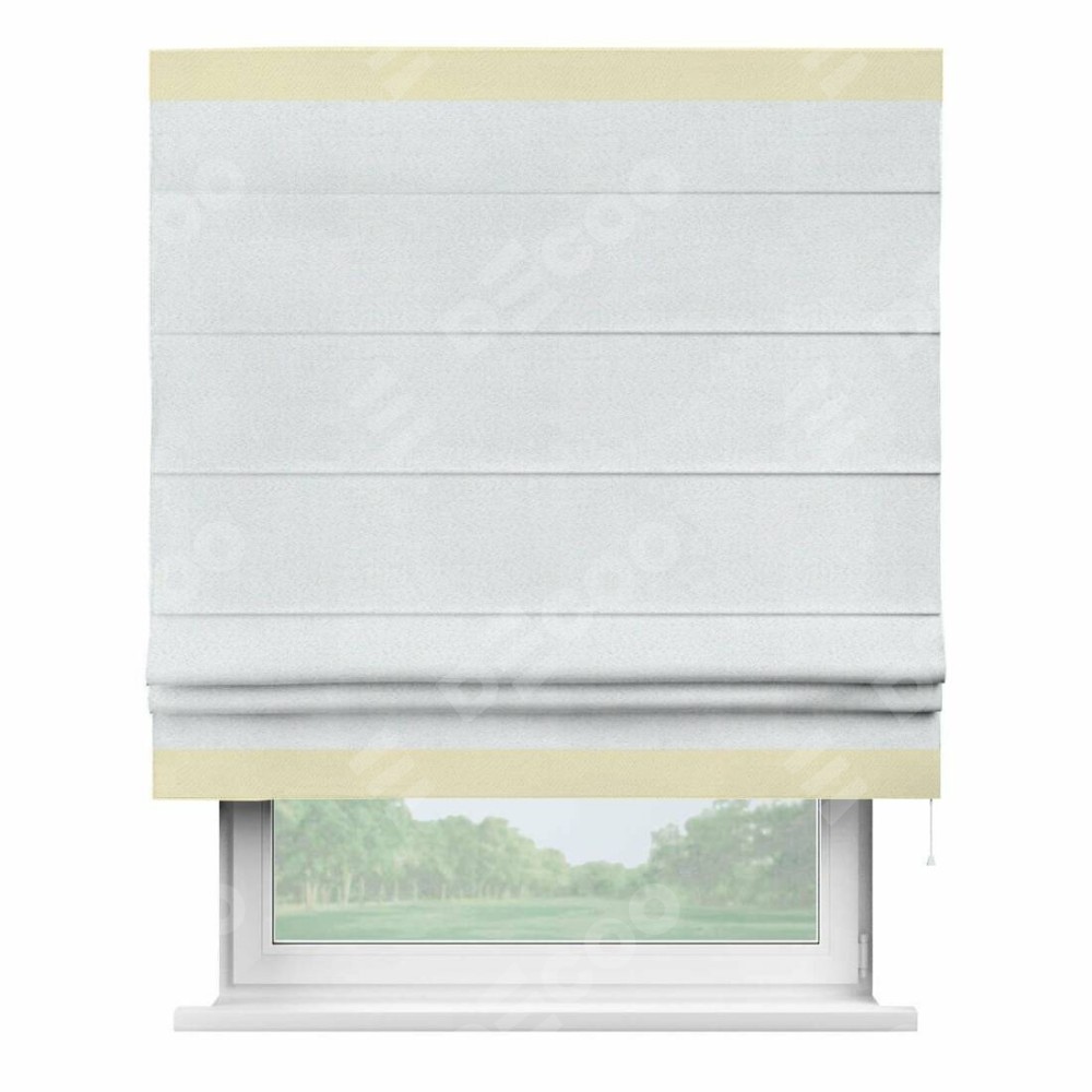 Римская штора производителя «Cortin», используется для проёма, пошита из ткани блэкаут однотонный дымчато-белый, артикул ткани 101. Отделка шторы кантом «Горизонт», ткань для канта используется из блэкаута однотонного разной расцветки на выбор. Имеет универсальный механизм и подходит для монтажа: на потолок, на стену и в нишу.