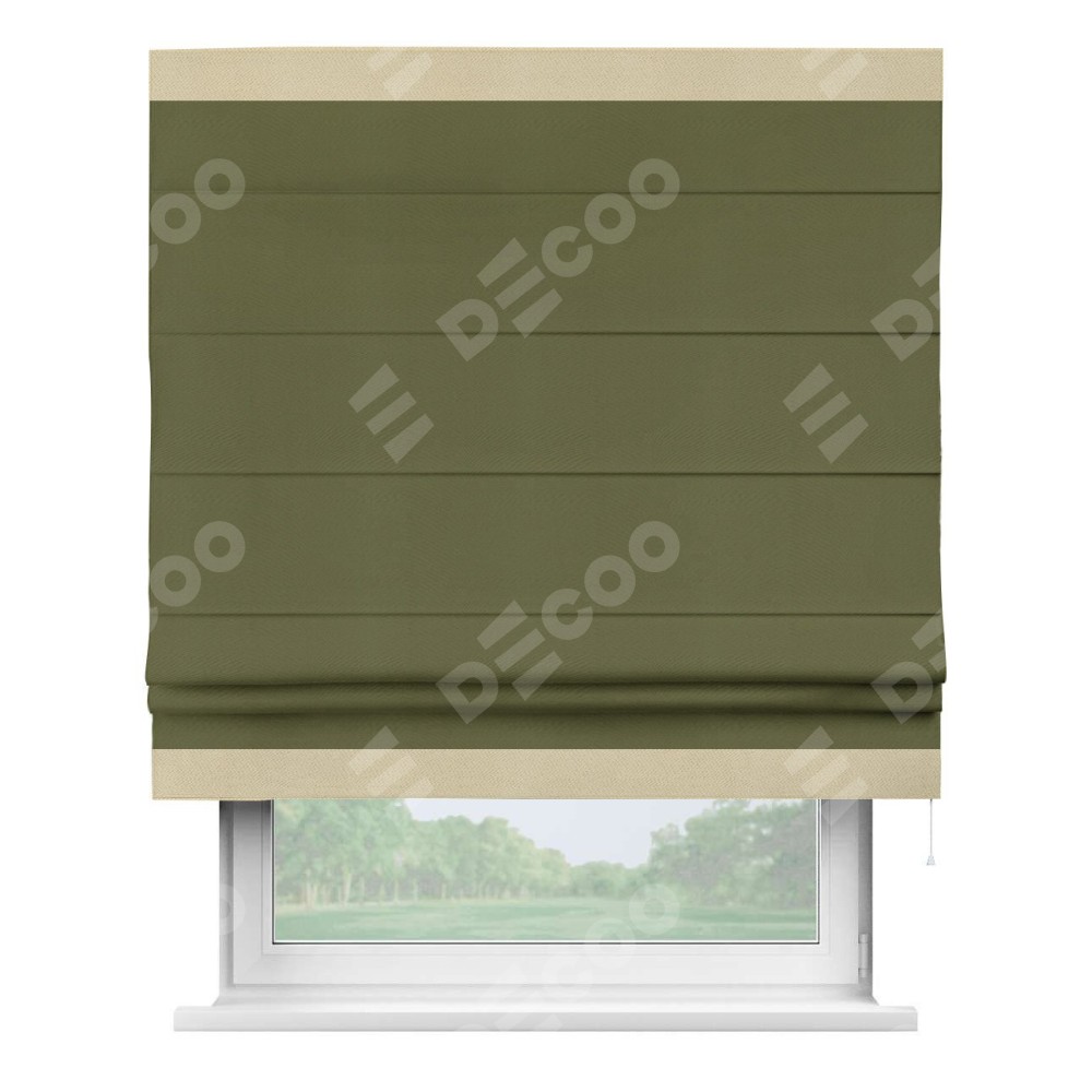 Римская штора производителя «Cortin», используется для проёма, пошита из ткани блэкаут однотонный зелёный, артикул ткани 81859. Отделка шторы кантом «Горизонт», ткань для канта используется из блэкаута однотонного разной расцветки на выбор. Имеет универсальный механизм и подходит для монтажа: на потолок, на стену и в нишу.