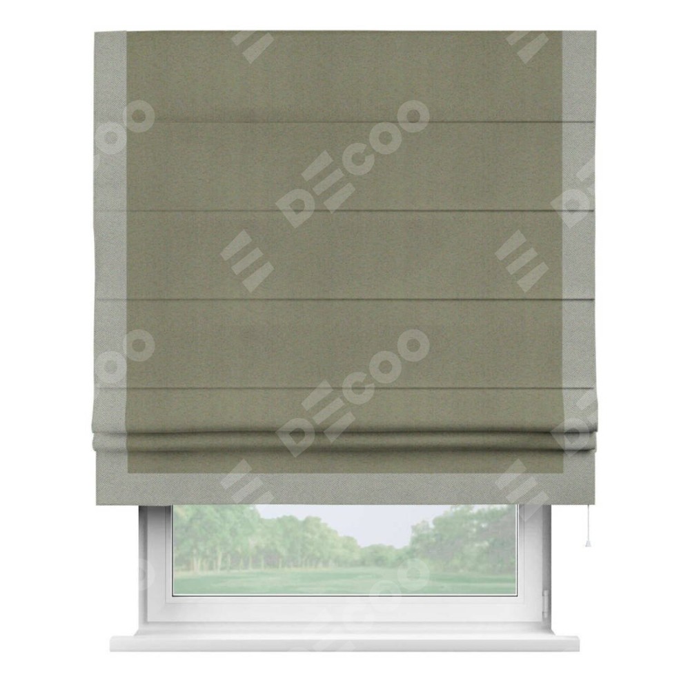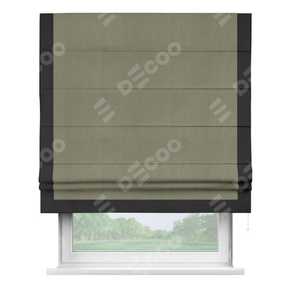 Римская штора производителя «Cortin», используется для проёма, пошита из ткани блэкаут однотонный серо-коричневый, артикул ткани 29568. Отделка шторы кантом «Виктория», ткань для канта используется из блэкаута однотонного разной расцветки на выбор. Имеет универсальный механизм и подходит для монтажа: на потолок, на стену и в нишу.