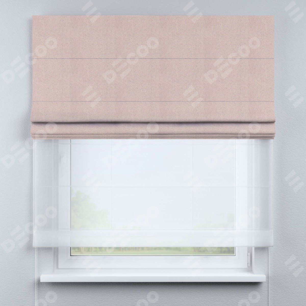 Римская штора день-ночь производителя «Cortin», используется для проёма, пошита из двух полотен, с лицевой стороны блэкаут тиснение с блеском сиреневый артикул 34649, вторая ткань тюль (по стандарту комплектуется тюль белого цвета артикул V-01). Изнаночная сторона основного материала черного цвета, что обеспечивает необходимую светонепроницаемость. Имеет универсальный механизм и подходит для монтажа: на потолок, на стену и в нишу.