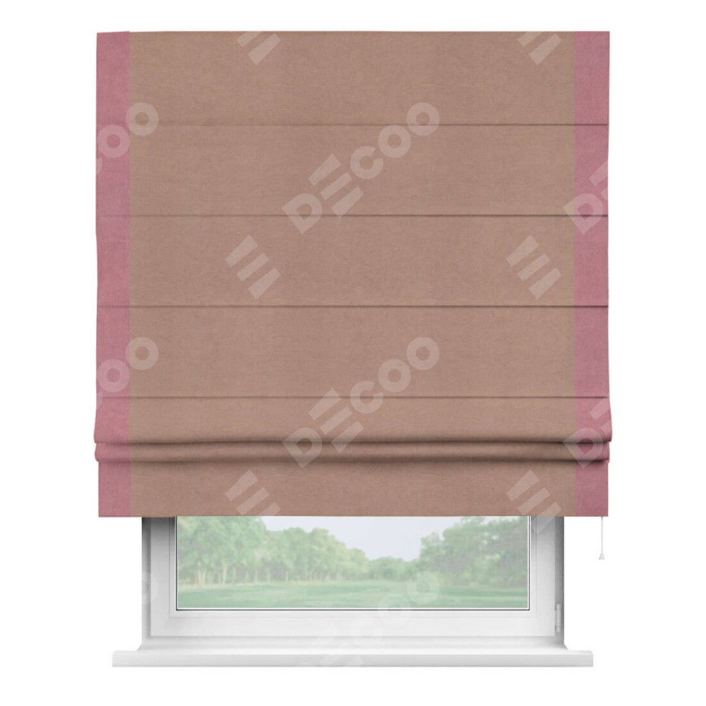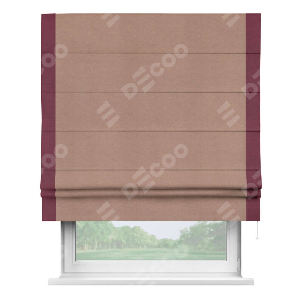 Римская штора производителя «Cortin», используется для проёма, пошита из ткани вельвет брусничный джем, артикул ткани 17750. Отделка шторы кантом «Стрим Дуо», ткань для канта используется из вельвета разной расцветки на выбор. Имеет универсальный механизм и подходит для монтажа: на потолок, на стену и в нишу.