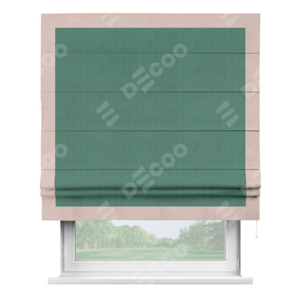 Римская штора производителя «Cortin», используется для проёма, пошита из ткани блэкаут с блеском изумрудный, артикул 34628. Отделка шторы кантом «Чесс», ткань для канта используется из блэкаута с блеском разной расцветки на выбор. Изнаночная сторона материала черного цвета, что обеспечивает необходимую светонепроницаемость. Имеет универсальный механизм и подходит для монтажа: на потолок, на стену и в нишу.