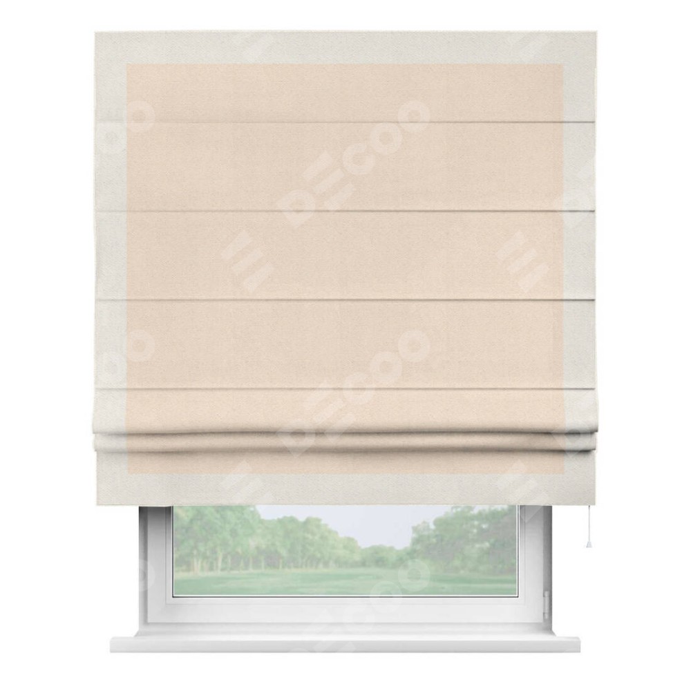 Римская штора производителя «Cortin», используется для проёма, пошита из ткани блэкаут с блеском розовая пудра, артикул 34632. Отделка шторы кантом «Чесс», ткань для канта используется из блэкаута с блеском разной расцветки на выбор. Изнаночная сторона материала черного цвета, что обеспечивает необходимую светонепроницаемость. Имеет универсальный механизм и подходит для монтажа: на потолок, на стену и в нишу.