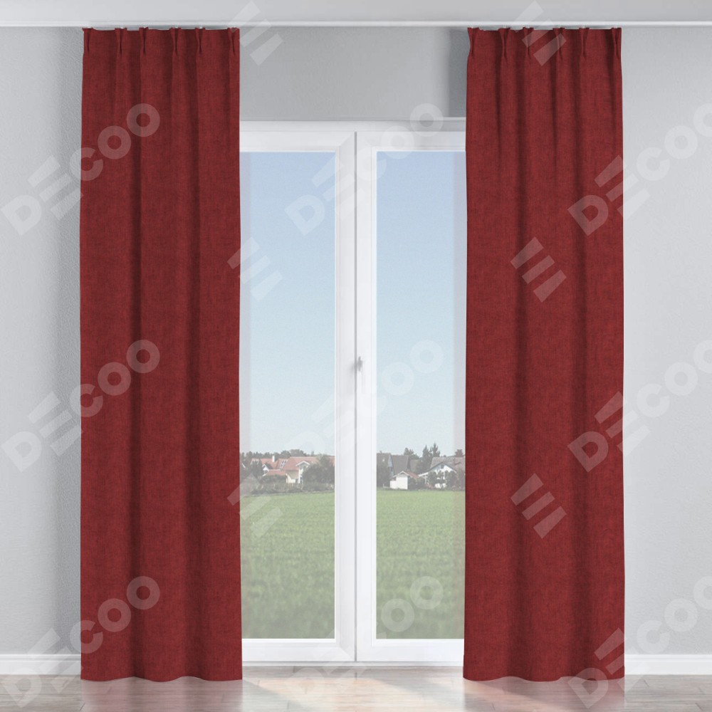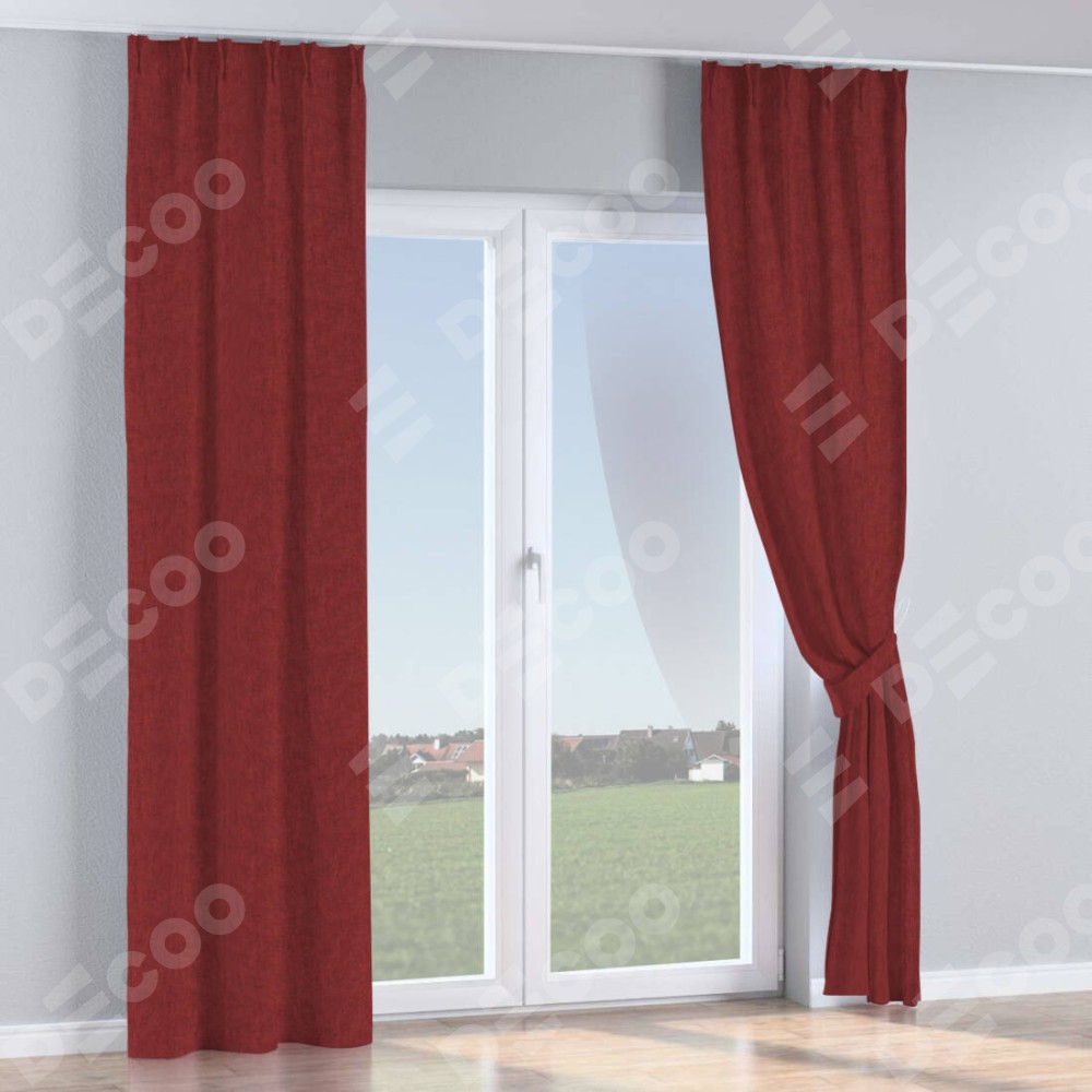 Комплект прямых штор, от производителя «Cortin», пошиты из ткани лён кашемир бордовый, артикул ткани 17213. С изнаночной стороны в верхней части штор пристрачивается шторная лента с декоративными складками «Кустик». Для создания элегантных складок прямые шторы шьются по стандарту с коэффициентом 1:2 (на 100 см. ширины проёма 200 см. ширины ткани).