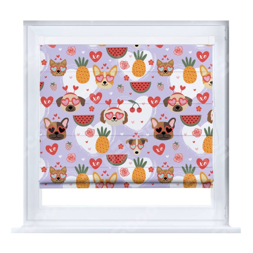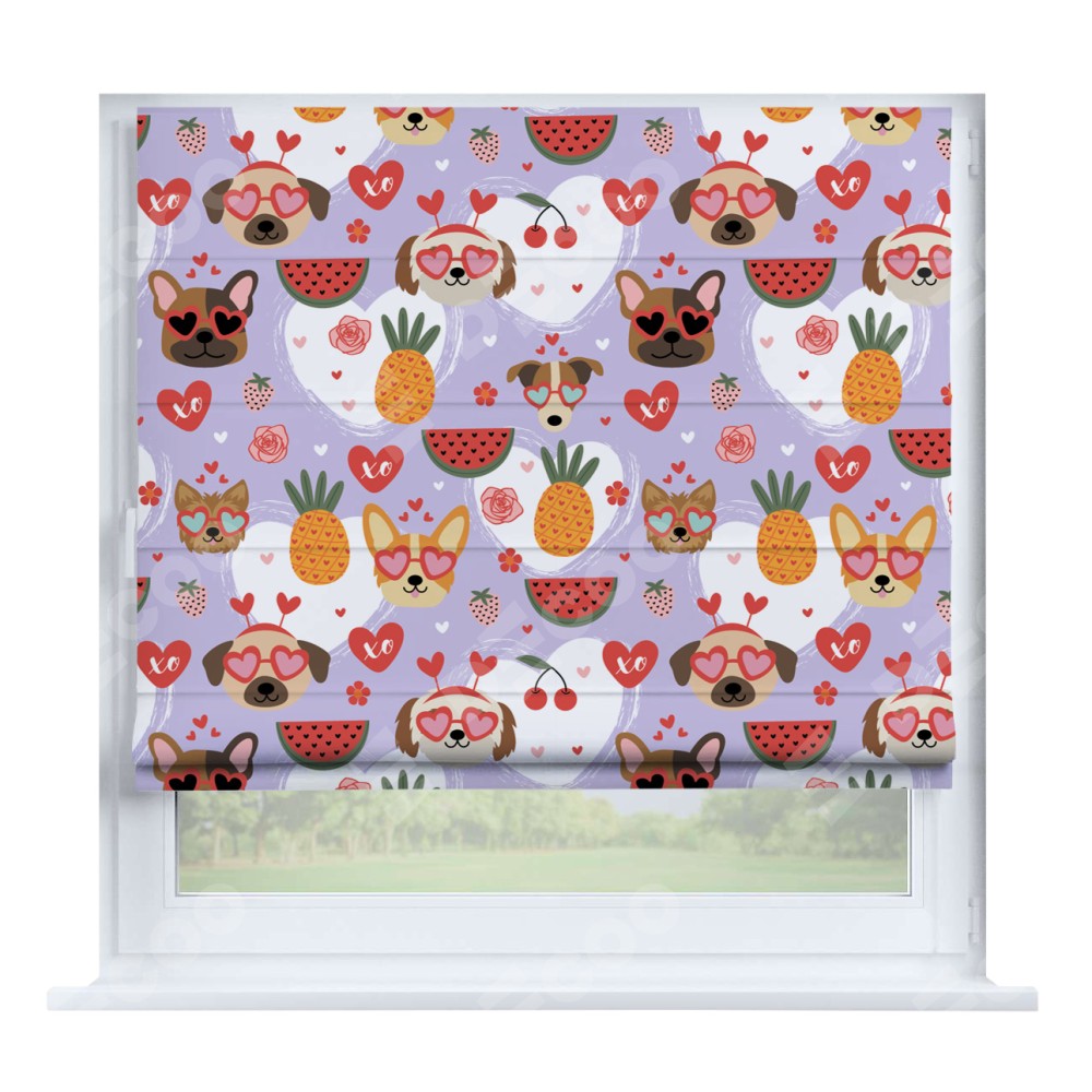 Римская штора производителя «Cortin», устанавливается на створку окна, пошита из ткани блэкаут с нанесением сублимационной печати «Забавные собачки». Штора шьётся по индивидуальным размерам, для данного типа римской шторы возможная ширина от 35 до 150 см., высота до 250 см.