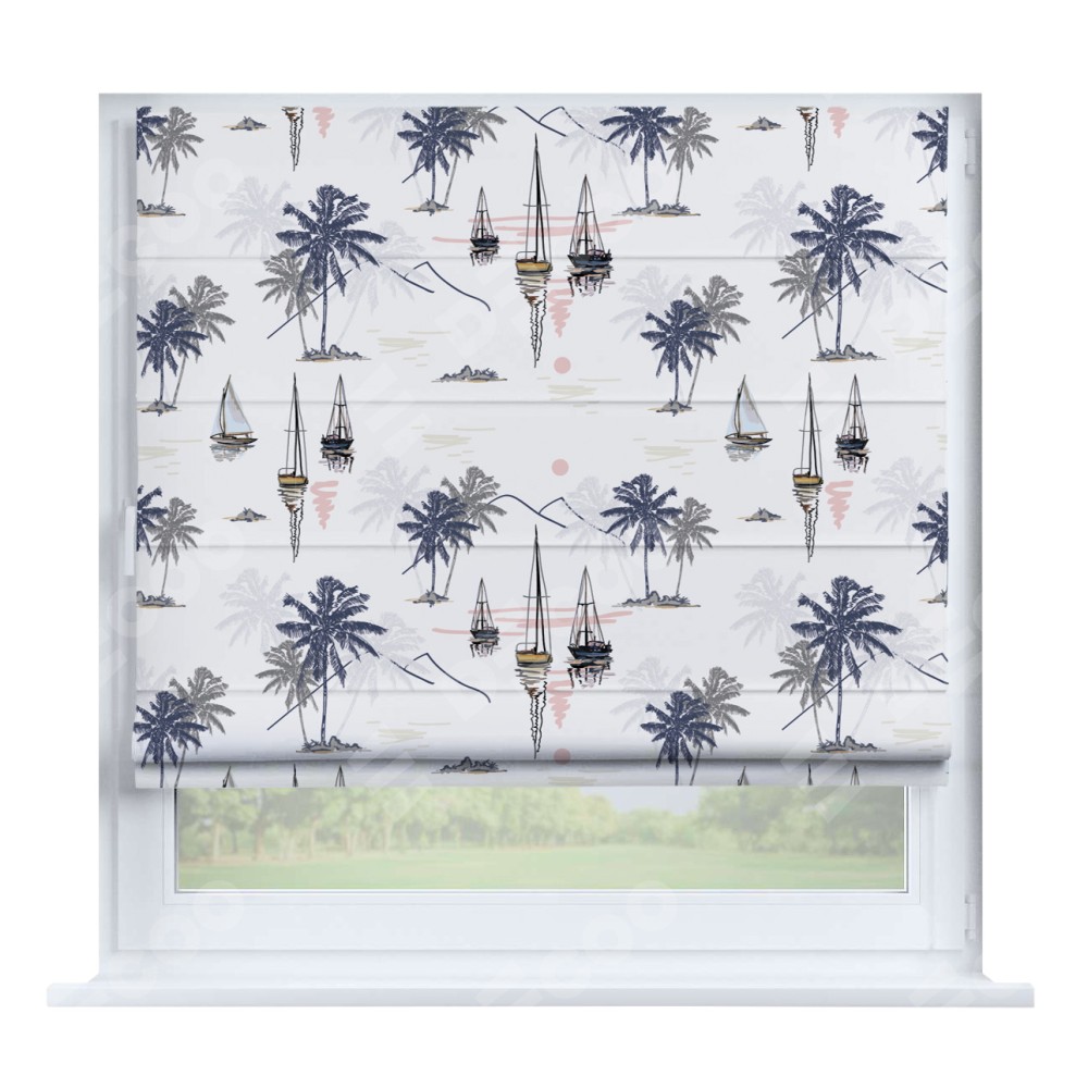 Римская штора производителя «Cortin», устанавливается на створку окна, пошита из ткани блэкаут с нанесением сублимационной печати «Морское путешествие». Штора шьётся по индивидуальным размерам, для данного типа римской шторы возможная ширина от 35 до 150 см., высота до 250 см.