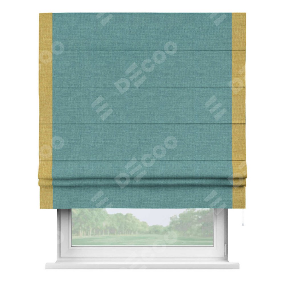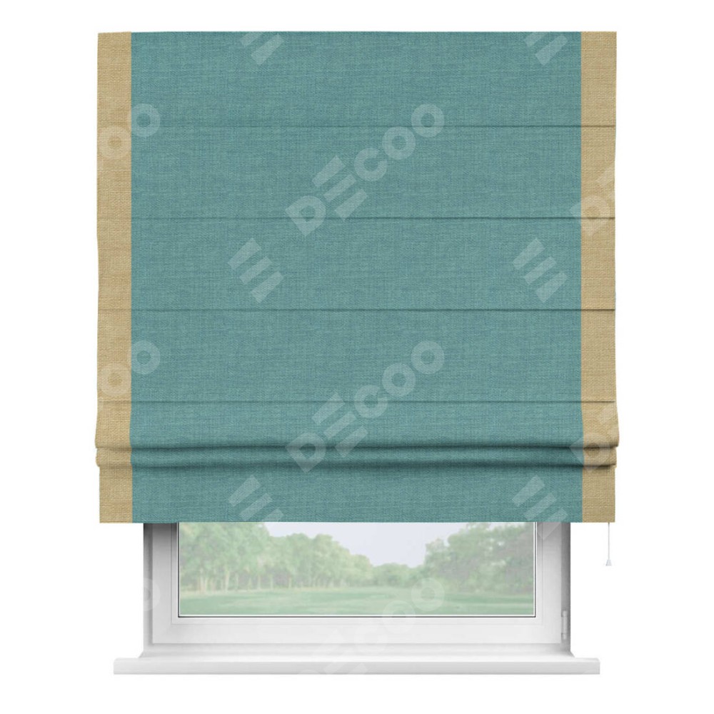 Римская штора производителя «Cortin», используется для проёма, пошита из ткани лён бирюза, артикул 7446. Отделка шторы кантом «Стрим Дуо», ткань для канта используется из льна разной расцветки на выбор. Имеет универсальный механизм и подходит для монтажа: на потолок, на стену и в нишу.