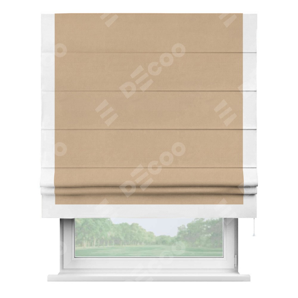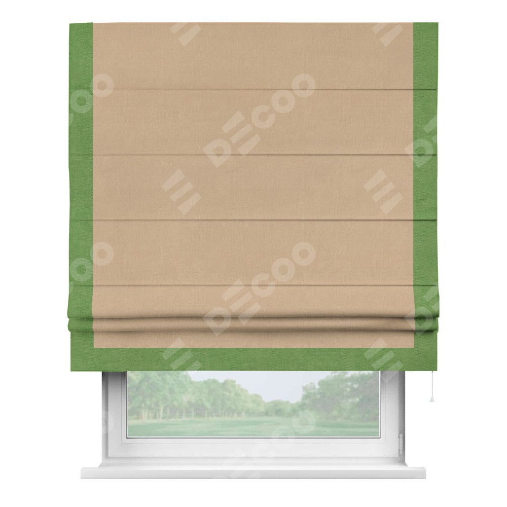 Римская штора производителя «Cortin», используется для проёма, пошита из ткани вельвет песочный, артикул ткани 17740. Отделка шторы кантом «Виктория», ткань для канта используется из вельвета разной расцветки на выбор. Имеет универсальный механизм и подходит для монтажа: на потолок, на стену и в нишу.