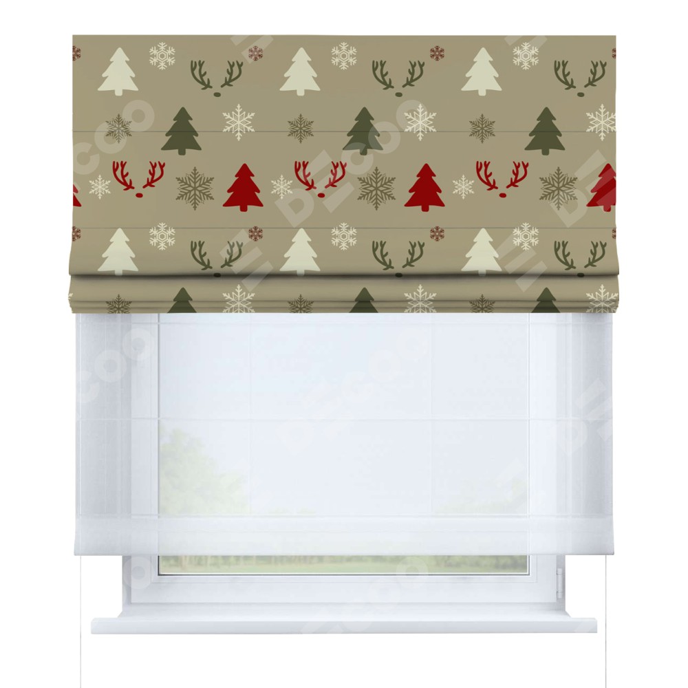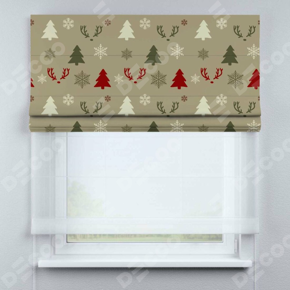 Римская штора день-ночь производителя «Cortin», используется для проёма, пошита из двух полотен, с лицевой блэкаут с нанесением сублимационной печати «Гармония рождества», вторая ткань тюль (по стандарту комплектуется тюль белого цвета артикул V-01). Имеет универсальный механизм и подходит для монтажа: на потолок, на стену и в нишу.