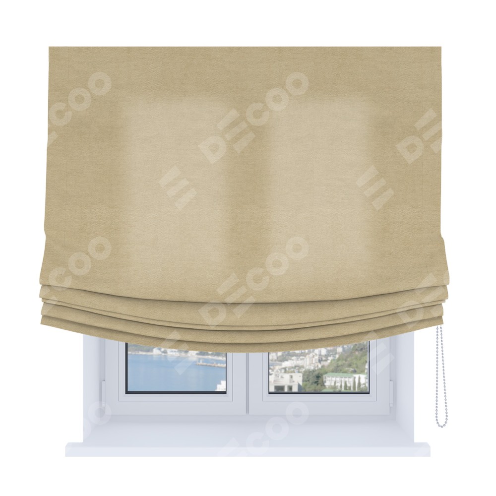 Римская штора Soft производителя «Cortin», используется для проёма, пошита из ткани вельвет бежевый, артикул ткани 85538. Имеет универсальный механизм и подходит для монтажа: на потолок, на стену и в нишу. В отличие от стандартных римских штор, римская штора Soft не имеет горизонтальных вставок и нижнего отвеса. Это позволяет ткани произвольно драпироваться в свободные мягкие складки.