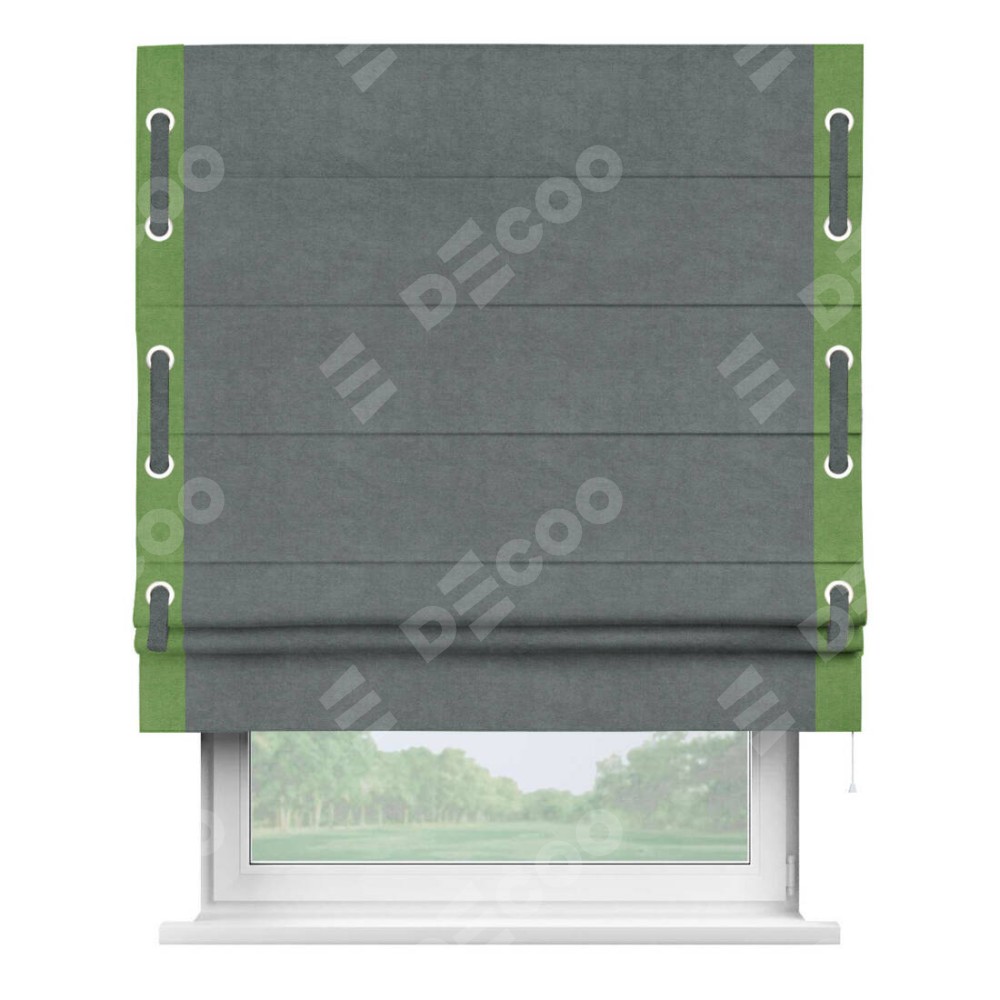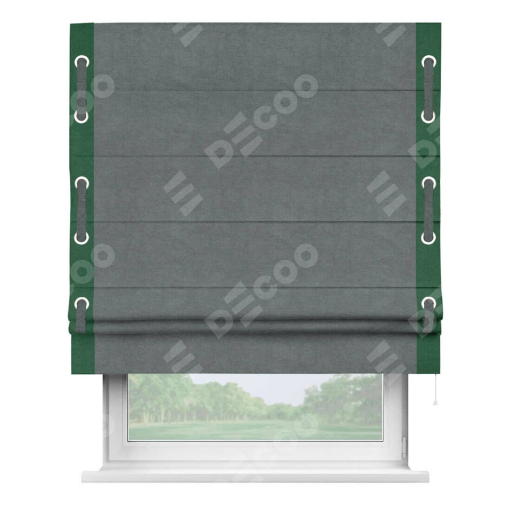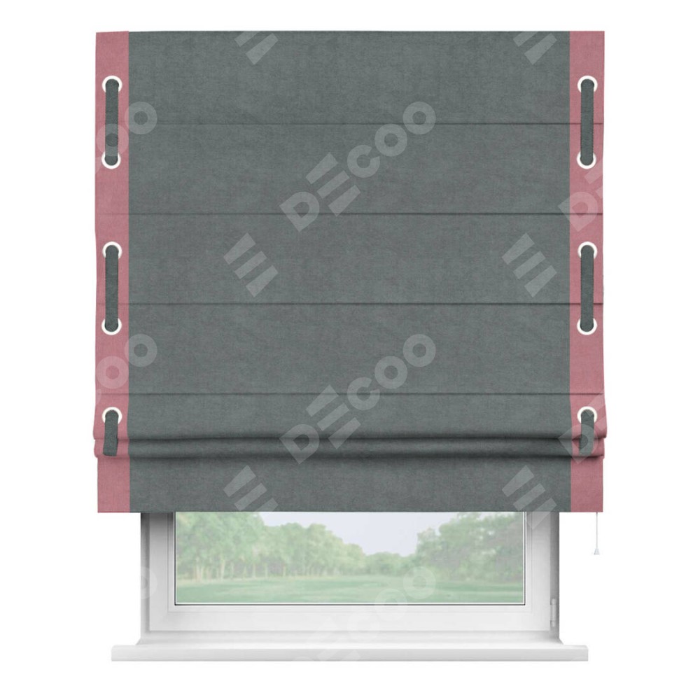 Римская штора производителя «Cortin», используется для проёма, пошита из ткани вельвет серый, артикул ткани 85542. Отделка шторы кантом «Стрим Дуо» на кантах расположены люверсы с пояском, ткань для канта используется из вельвета разной расцветки на выбор. Ткань для пояска обычно используется из основной ткани шторы, а так же можно сделать из любой расцветки по желанию. Имеет универсальный механизм и подходит для монтажа: на потолок, на стену и в нишу.