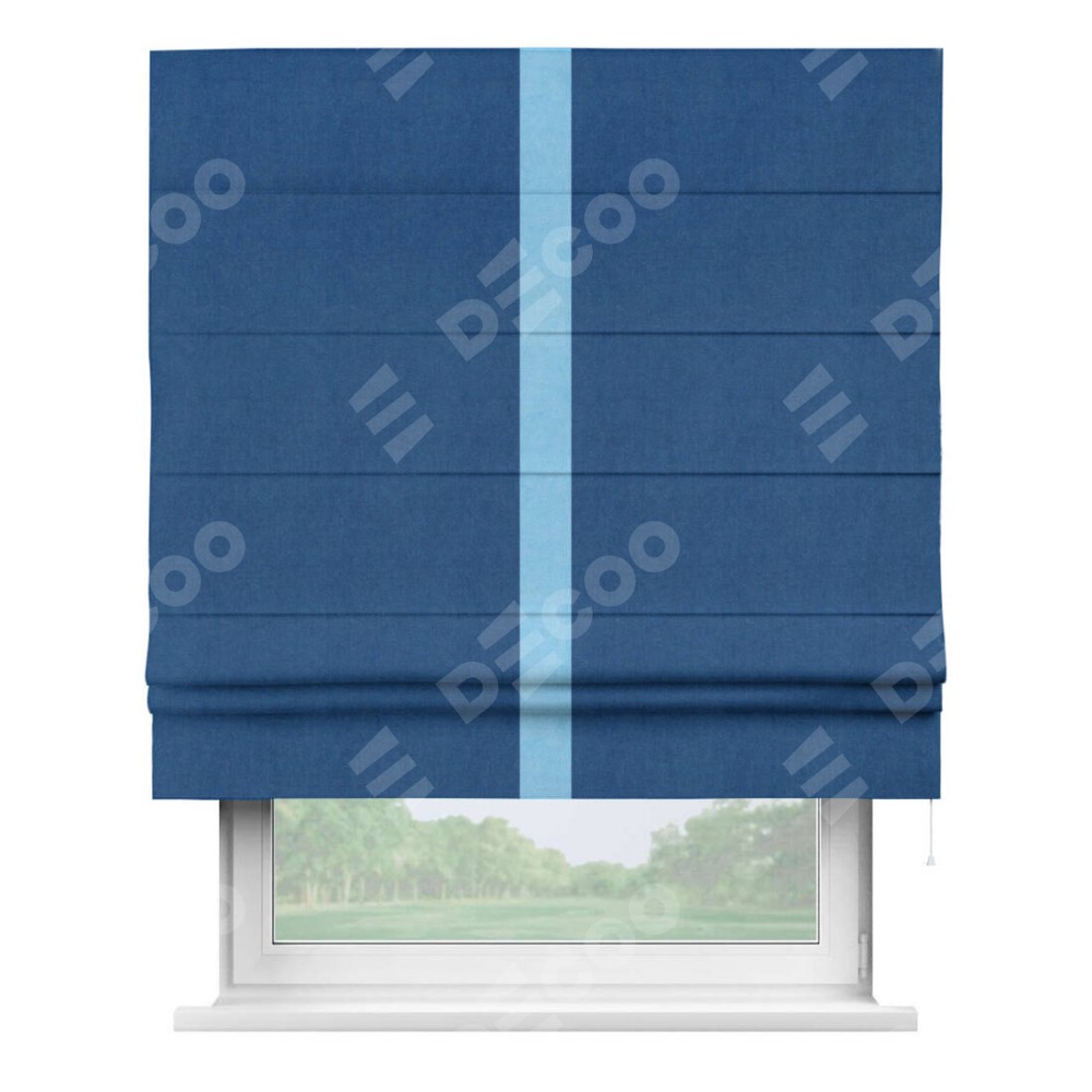 Римская штора производителя «Cortin», используется для проёма, пошита из ткани вельвет синий, артикул ткани 85554. Отделка шторы кантом «Хайвей», ткань для канта используется из вельвета разной расцветки на выбор. Имеет универсальный механизм и подходит для монтажа: на потолок, на стену и в нишу.