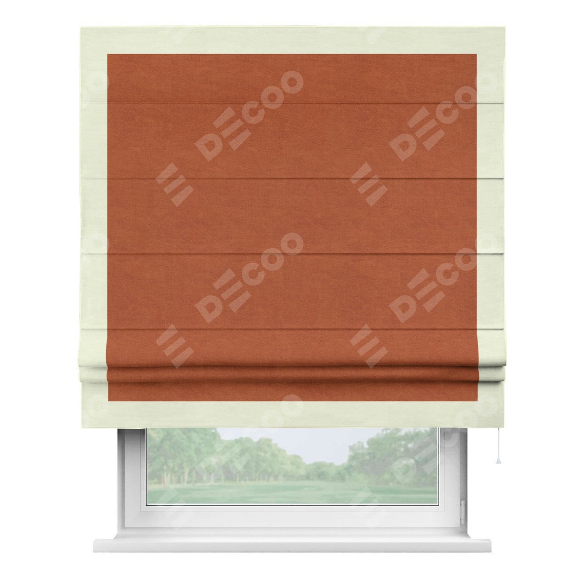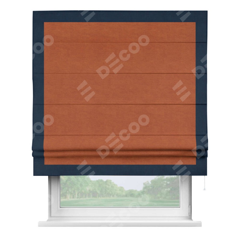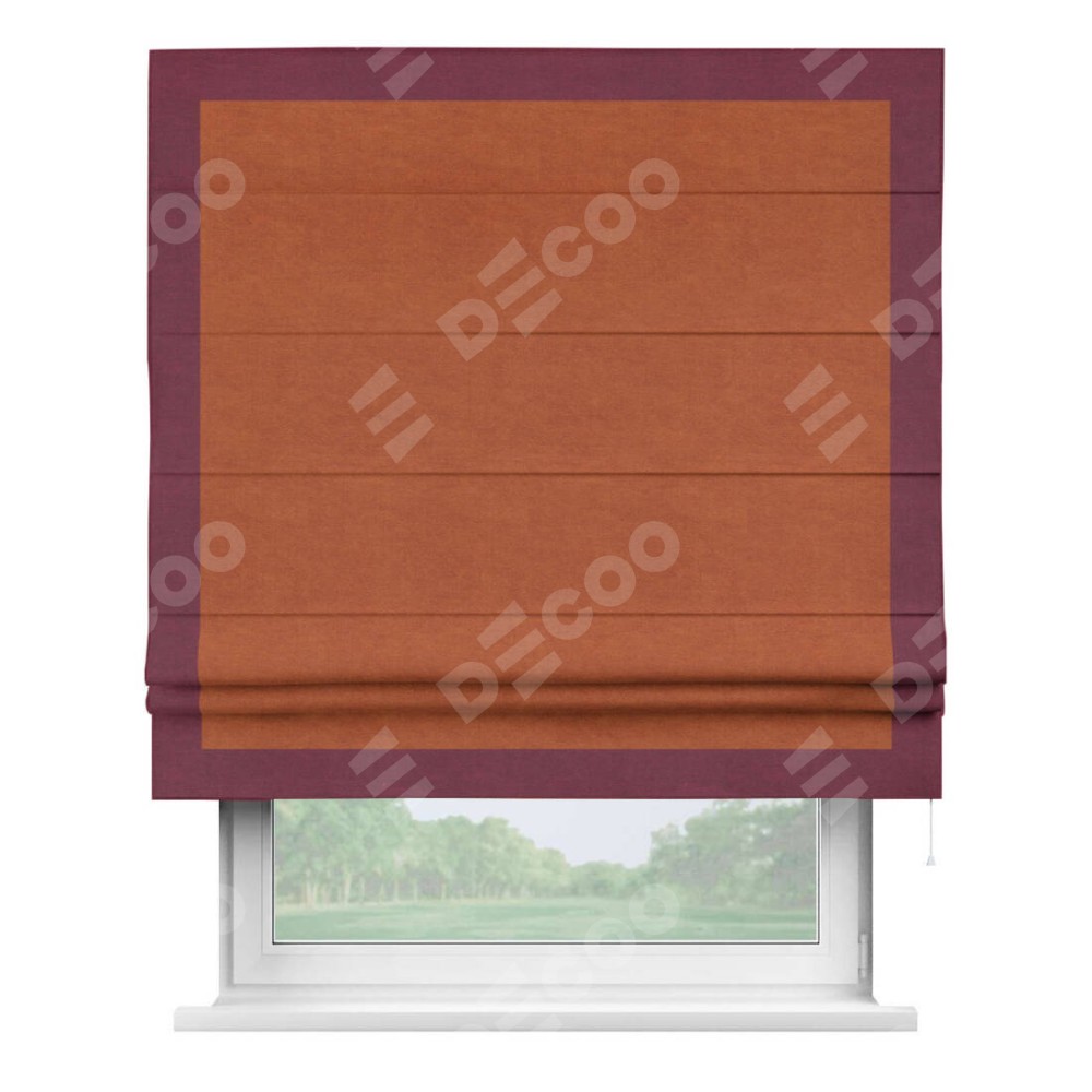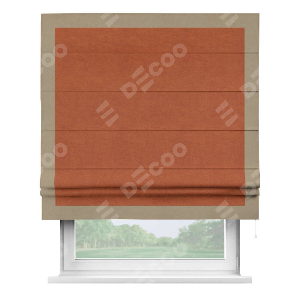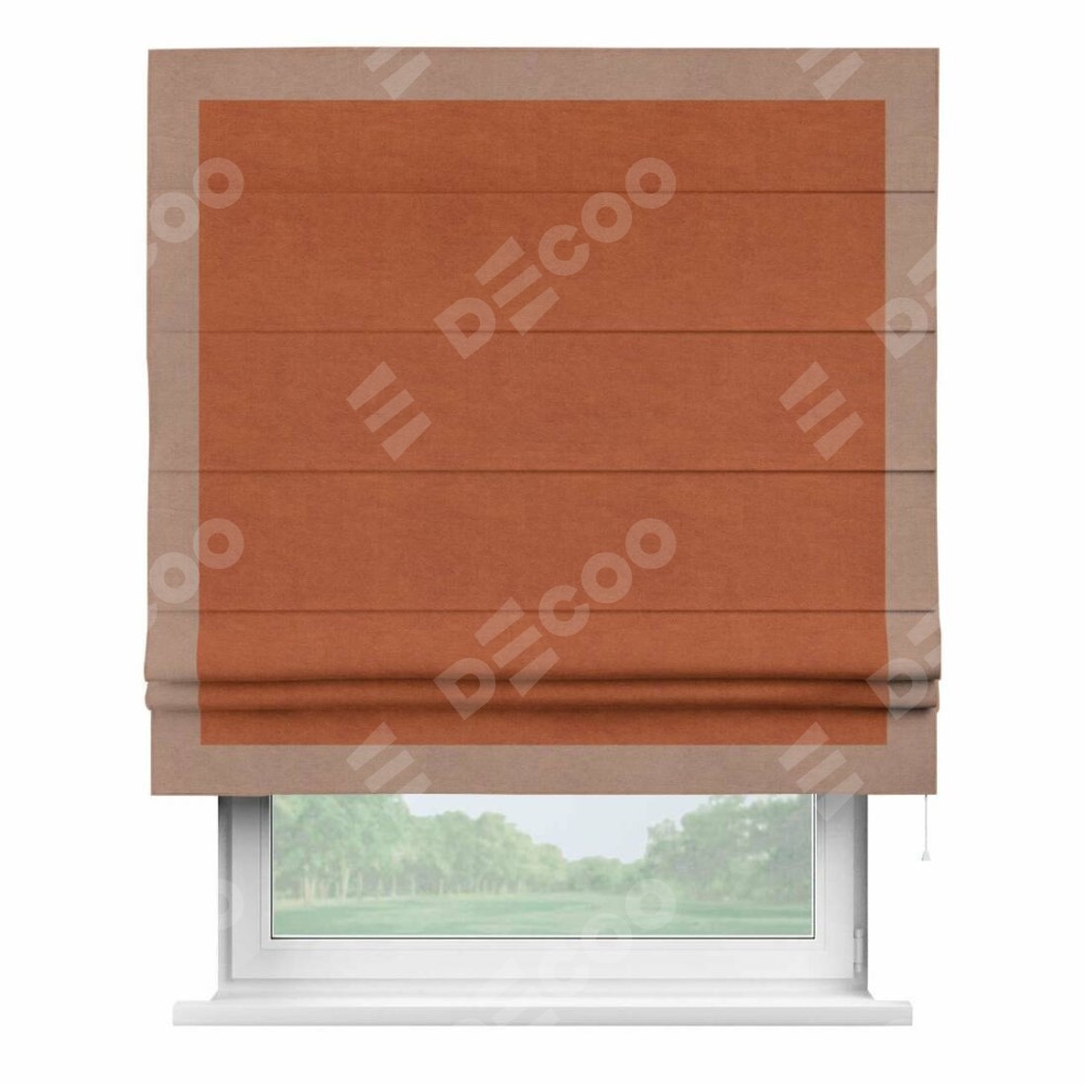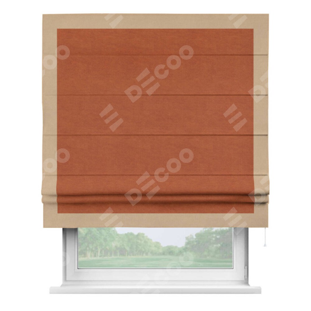 Римская штора производителя «Cortin», используется для проёма, пошита из ткани вельвет терракотовый, артикул ткани 85548. Отделка шторы кантом «Чесс», ткань для канта используется из вельвета разной расцветки на выбор. Имеет универсальный механизм и подходит для монтажа: на потолок, на стену и в нишу.