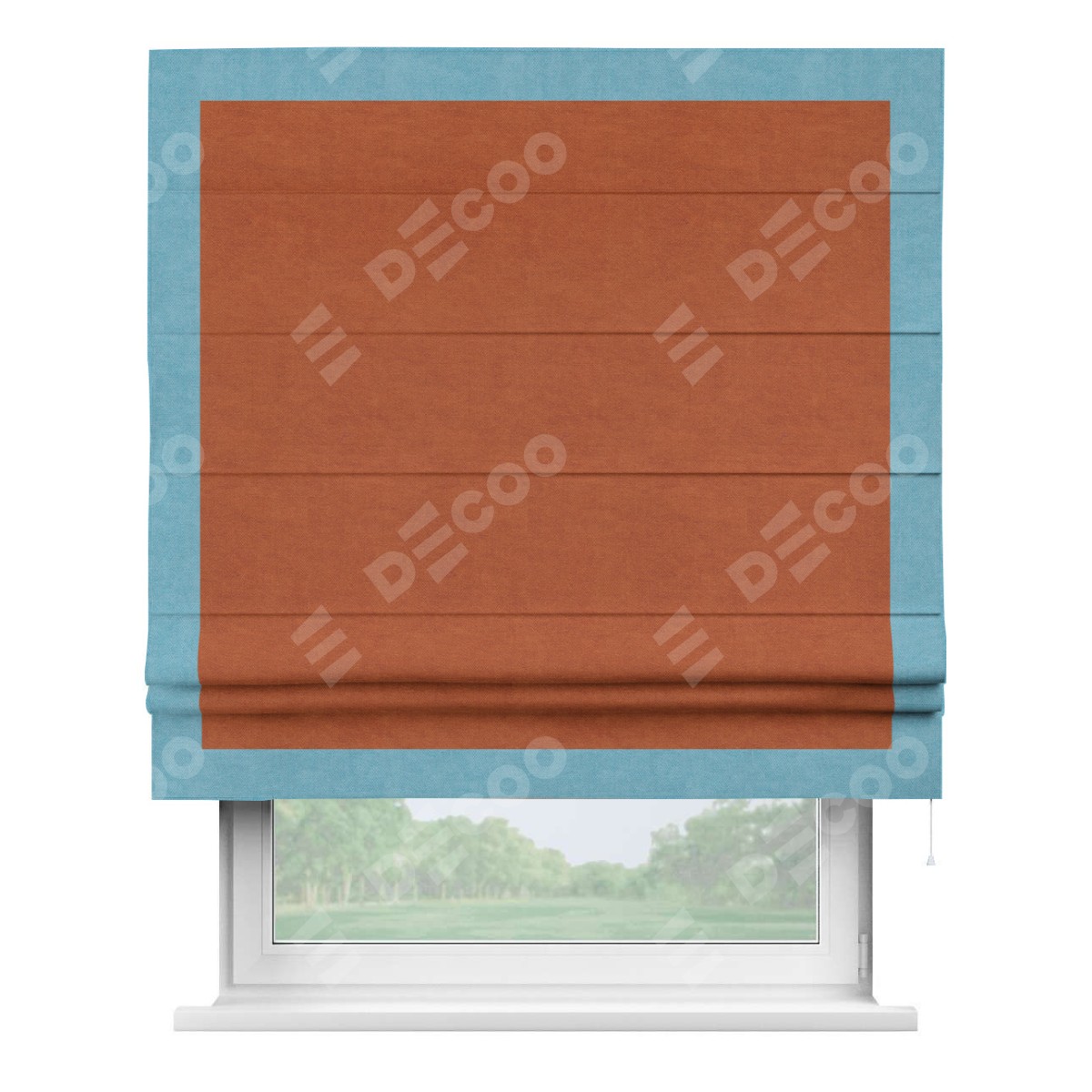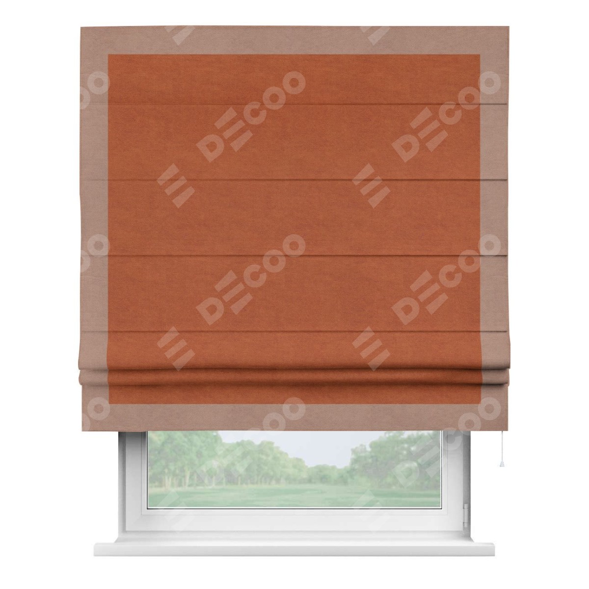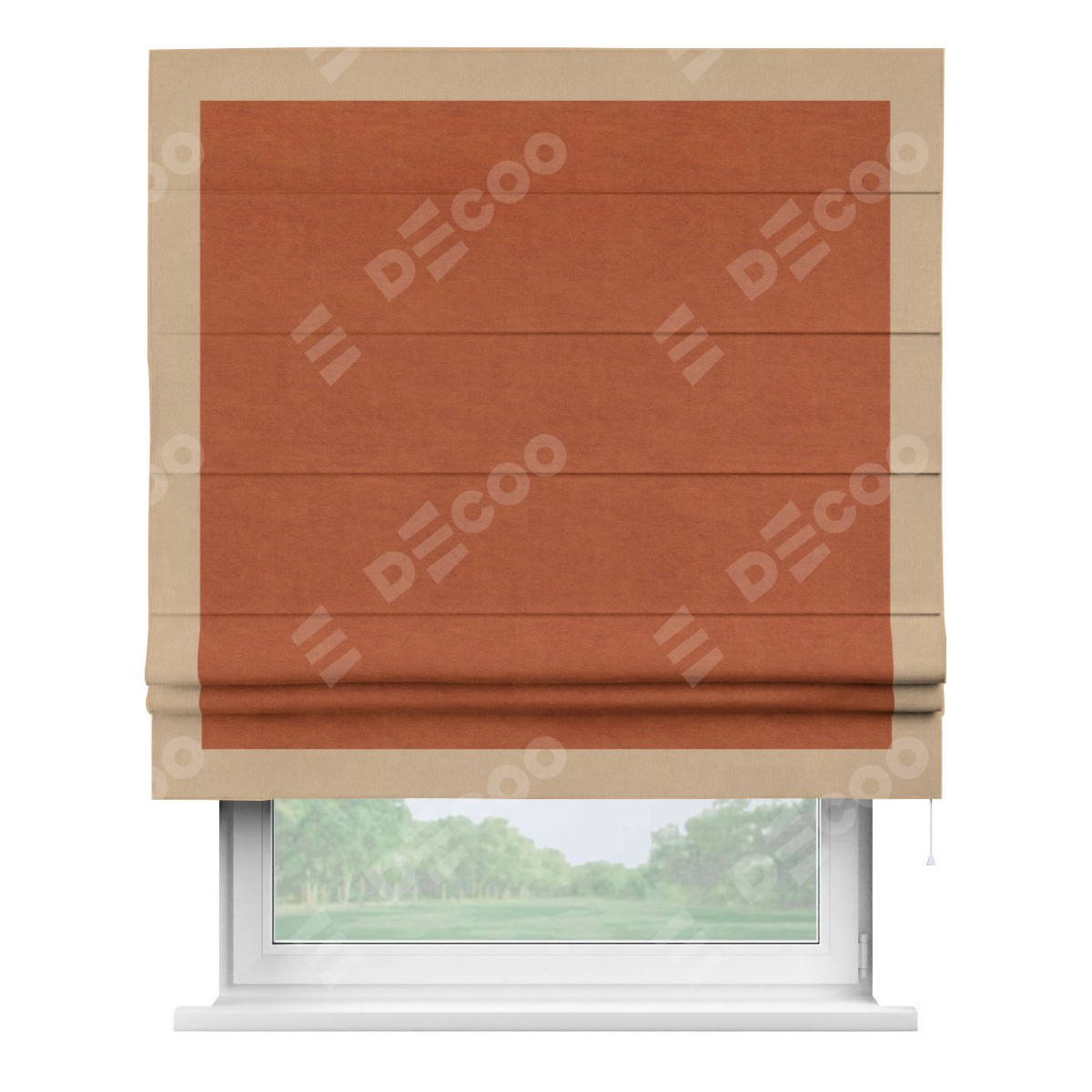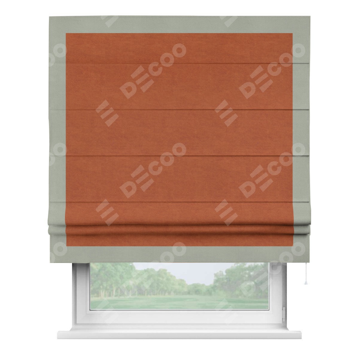 Римская штора производителя «Cortin», используется для проёма, пошита из ткани вельвет терракотовый, артикул ткани 85548. Отделка шторы кантом «Чесс», ткань для канта используется из вельвета разной расцветки на выбор. Имеет универсальный механизм и подходит для монтажа: на потолок, на стену и в нишу.