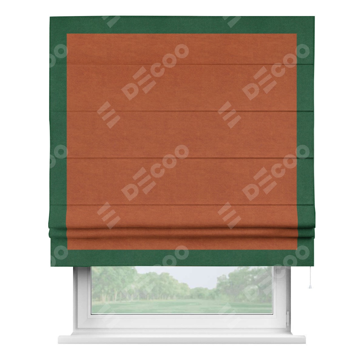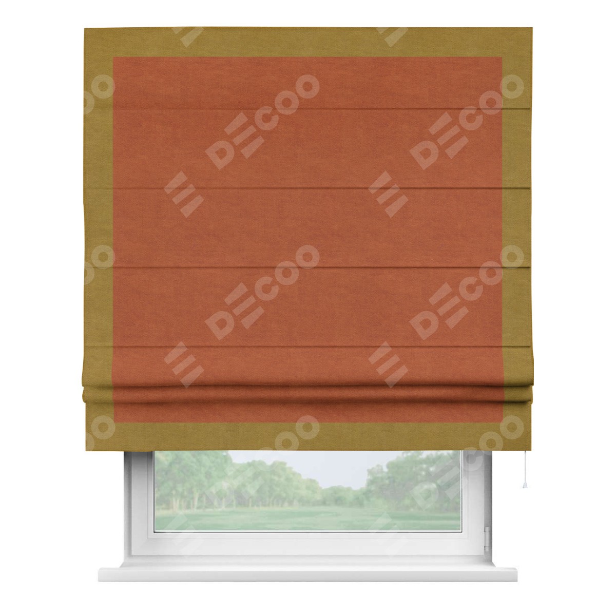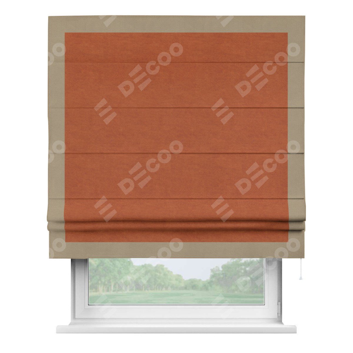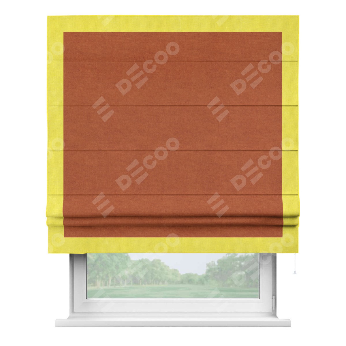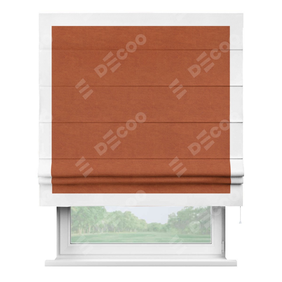 Римская штора производителя «Cortin», используется для проёма, пошита из ткани вельвет терракотовый, артикул ткани 85548. Отделка шторы кантом «Чесс», ткань для канта используется из вельвета разной расцветки на выбор. Имеет универсальный механизм и подходит для монтажа: на потолок, на стену и в нишу.