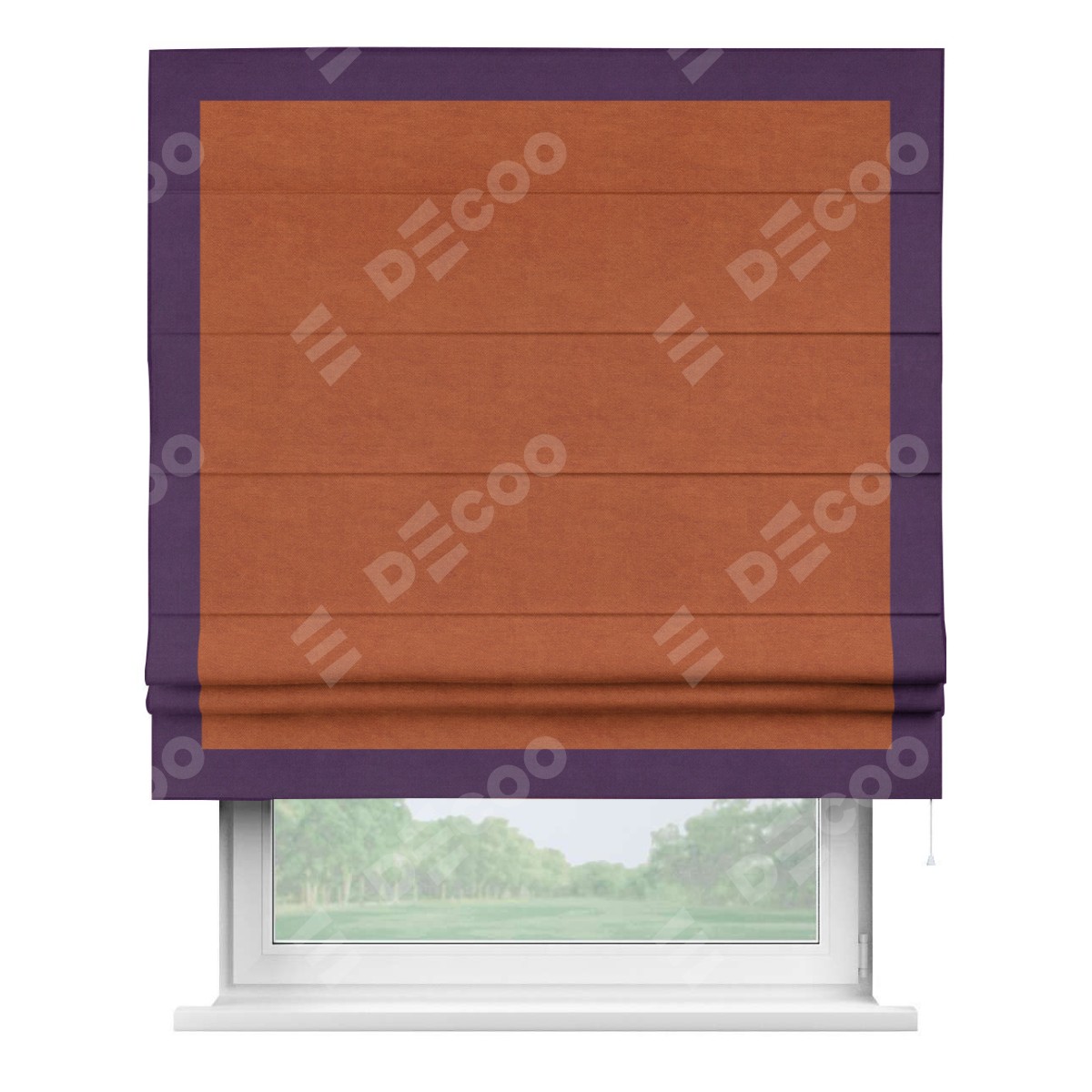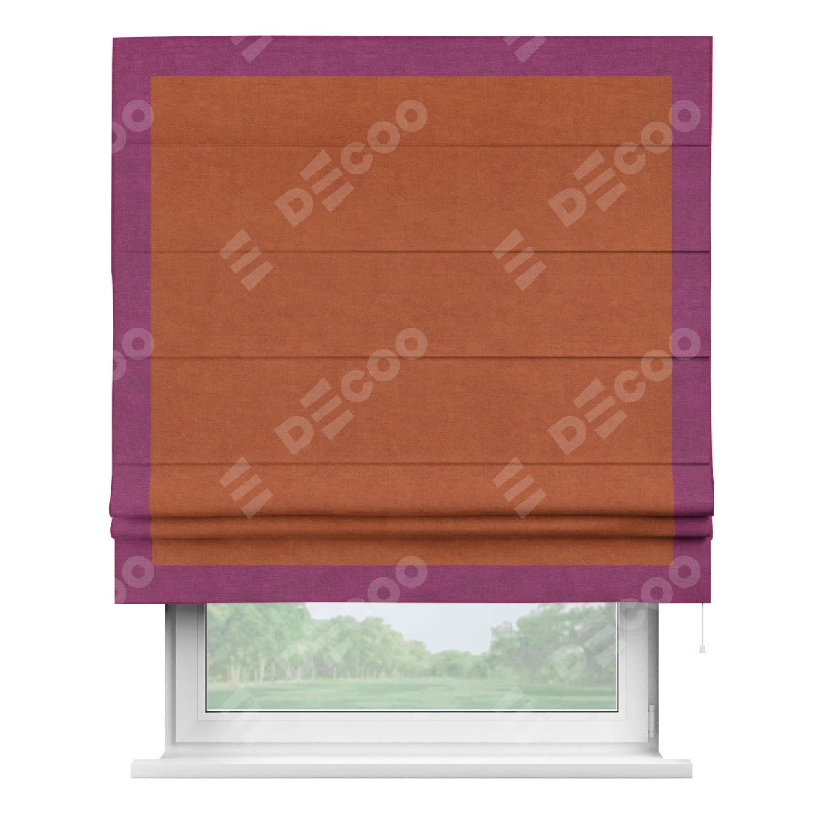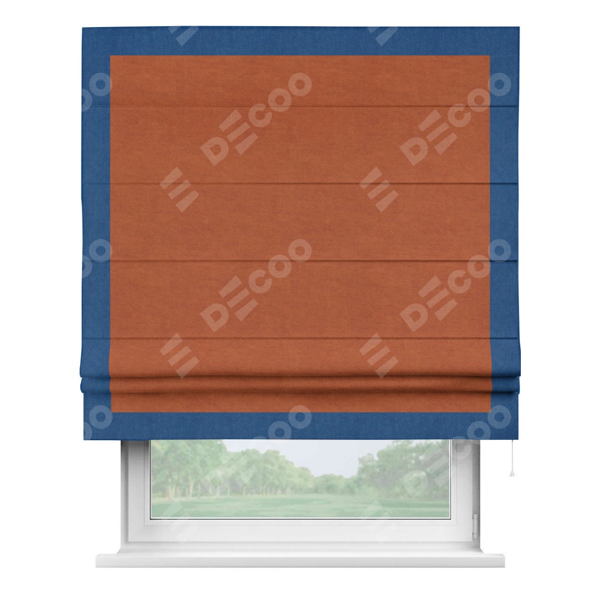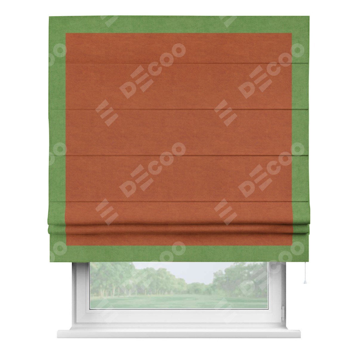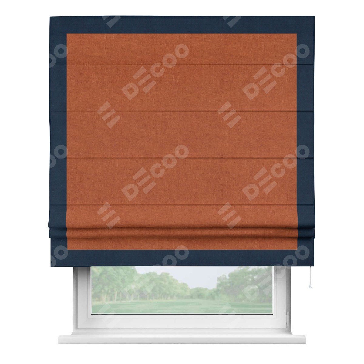 Римская штора производителя «Cortin», используется для проёма, пошита из ткани вельвет терракотовый, артикул ткани 85548. Отделка шторы кантом «Чесс», ткань для канта используется из вельвета разной расцветки на выбор. Имеет универсальный механизм и подходит для монтажа: на потолок, на стену и в нишу.