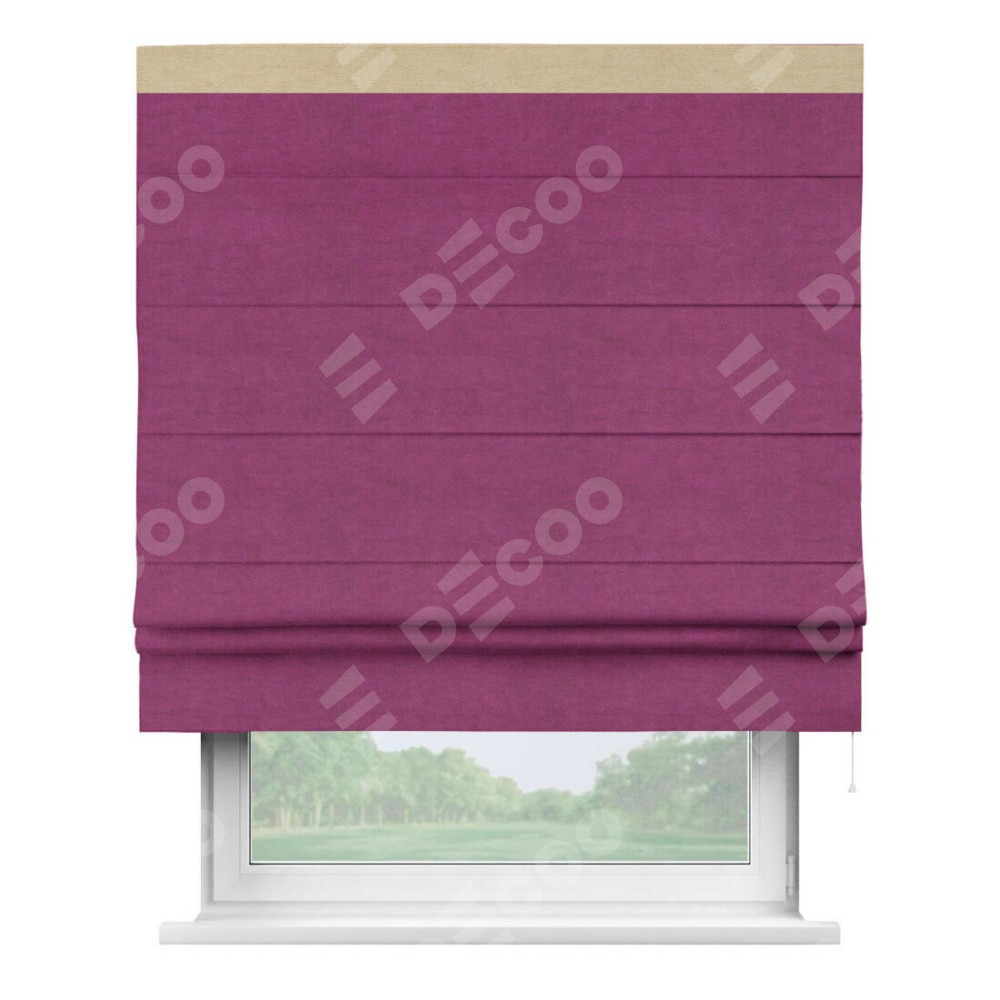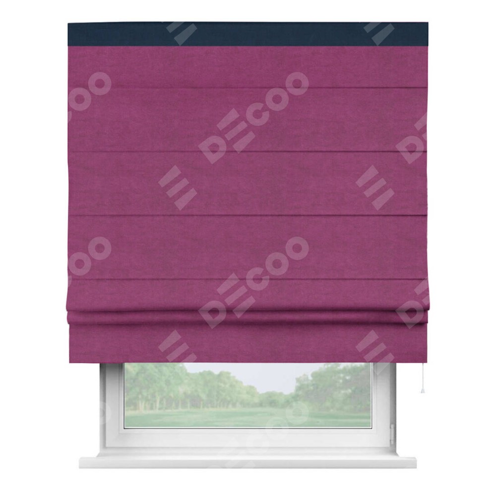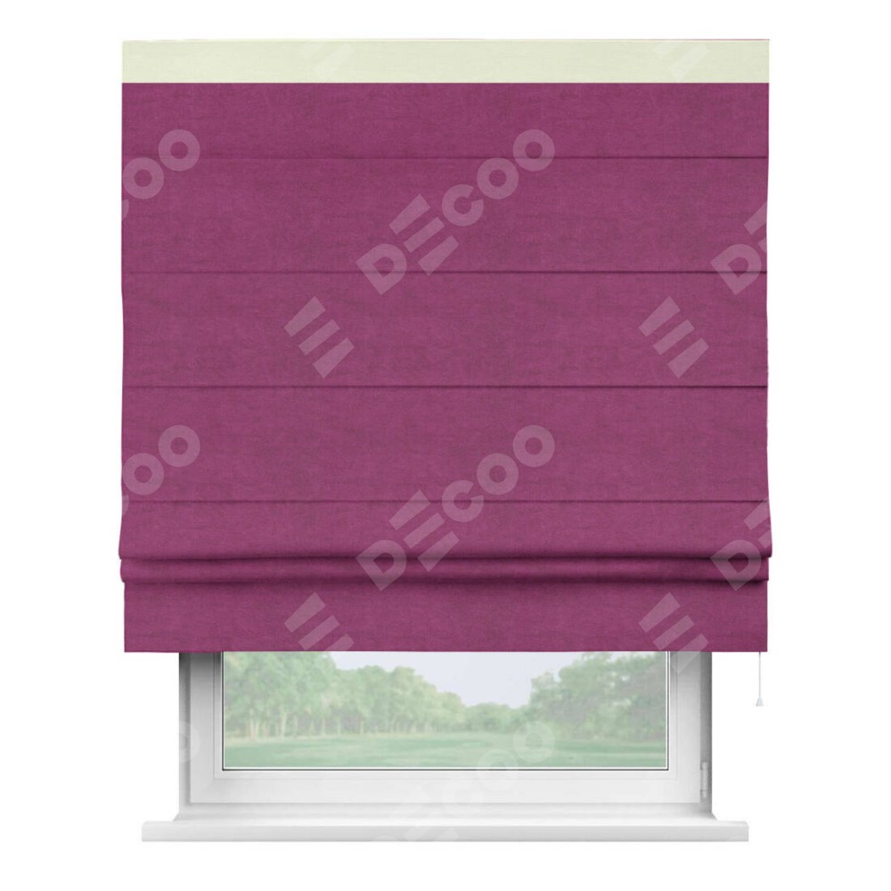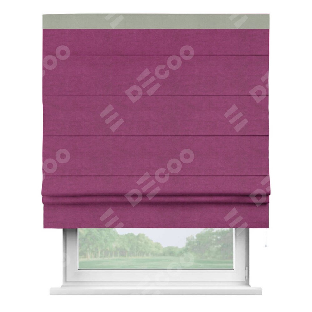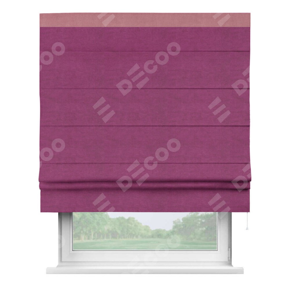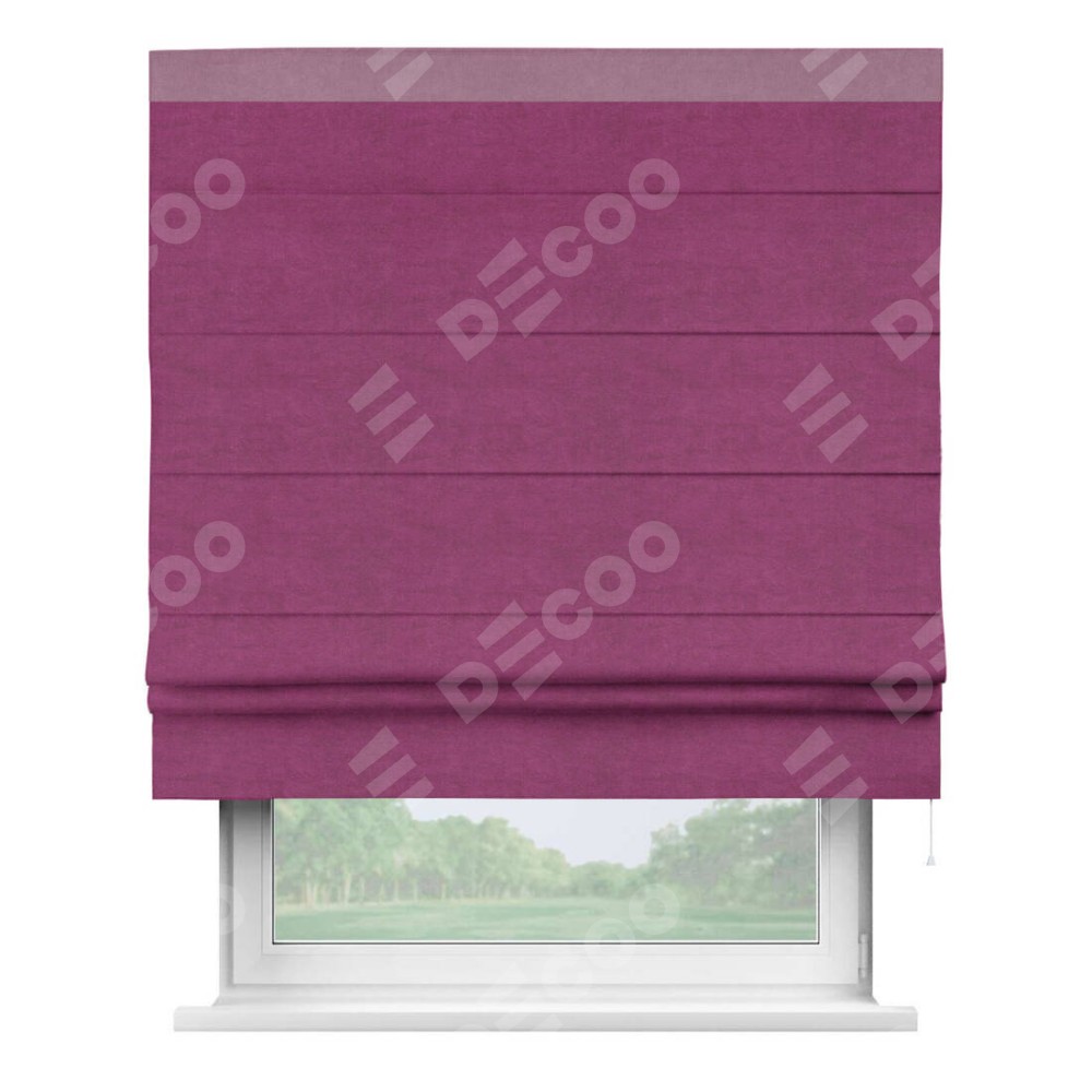 Римская штора производителя «Cortin», используется для проёма, пошита из ткани вельвет фиолетовый, артикул ткани 85552. Отделка шторы кантом «Кинг», ткань для канта используется из вельвета разной расцветки на выбор. Имеет универсальный механизм и подходит для монтажа: на потолок, на стену и в нишу.