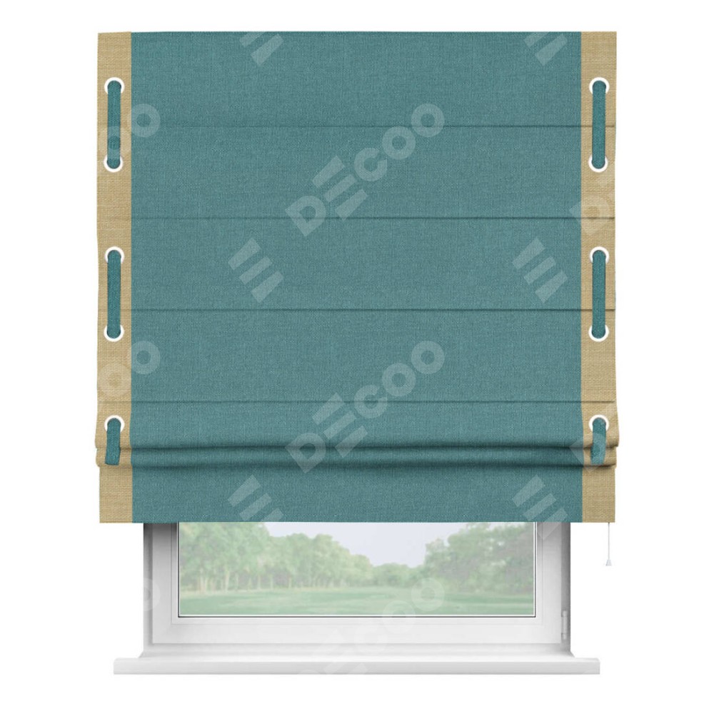 Римская штора производителя «Cortin», используется для проёма, пошита из ткани лён бирюзовый, артикул 53436. Отделка шторы кантом «Стрим Дуо» на кантах расположены люверсы с пояском, ткань для канта используется из льна разной расцветки на выбор. Ткань для пояска обычно используется из основной ткани шторы, а так же можно сделать из любой расцветки по желанию. Имеет универсальный механизм и подходит для монтажа: на потолок, на стену и в нишу.