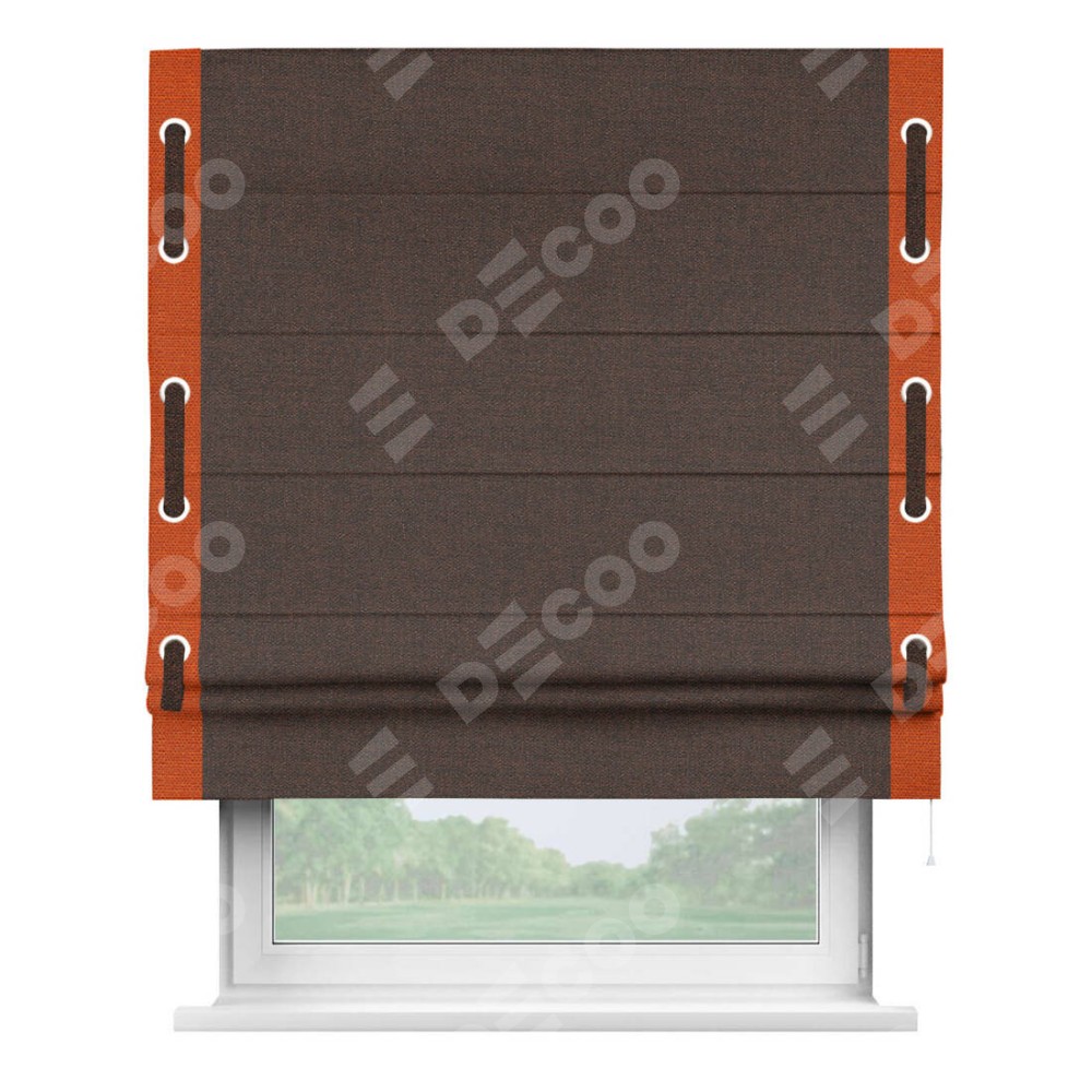 Римская штора производителя «Cortin», используется для проёма, пошита из ткани лён коричневый, артикул 53443. Отделка шторы кантом «Стрим Дуо» на кантах расположены люверсы с пояском, ткань для канта используется из льна разной расцветки на выбор. Ткань для пояска обычно используется из основной ткани шторы, а так же можно сделать из любой расцветки по желанию. Имеет универсальный механизм и подходит для монтажа: на потолок, на стену и в нишу.
