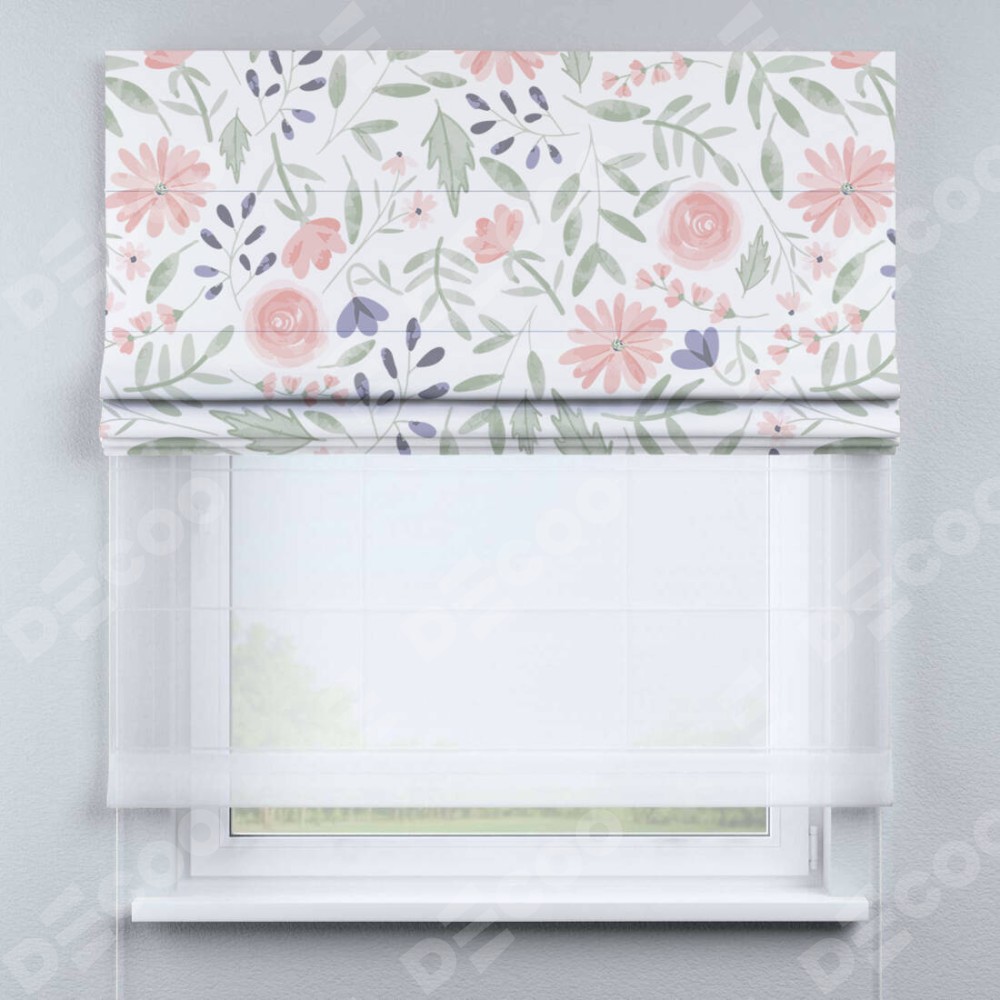 Римская штора день-ночь производителя «Cortin», используется для проёма, пошита из двух полотен, с лицевой блэкаут с нанесением сублимационной печати «Изысканные цветы», вторая ткань тюль (по стандарту комплектуется тюль белого цвета артикул V-01). Имеет универсальный механизм и подходит для монтажа: на потолок, на стену и в нишу.