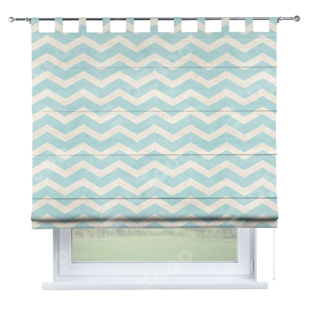 Римская штора производителя «Cortin», используется для проёма, пошита из ткани блэкаут с нанесением сублимационной печати «Голубой шеврон». Данная модель пошита на петлях, комплектуется на выбор круглым карнизом и подходит для монтажа на стену. Римская штора на петлях имеет простую систему регулировки высоты, отличительным преимуществом данной модели является простой способ монтажа. Достаточно повесить ее на трубу и штора готова!