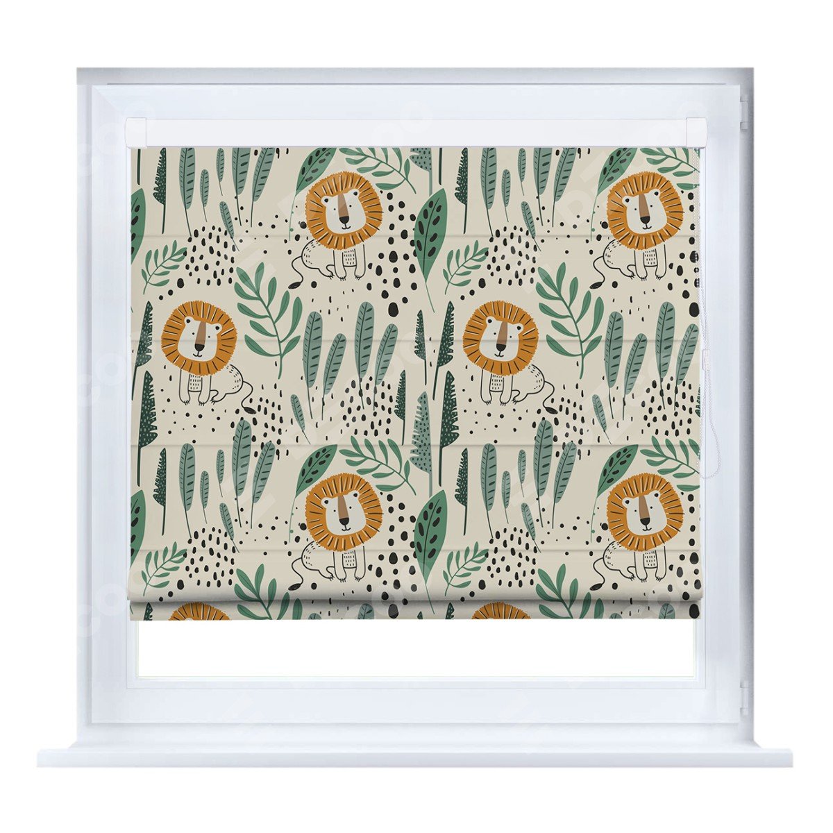 Римская штора кассетного типа, производителя «Cortin», устанавливается только на пластиковые окна и прилегает к стеклопакету, пошита из ткани блэкаут с нанесением сублимационной печати «Лев из джунглей».