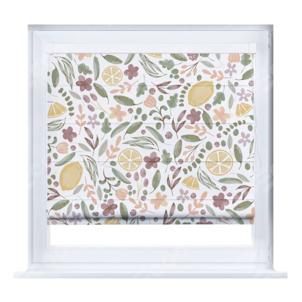 Римская штора производителя «Cortin», устанавливается на створку окна, пошита из ткани блэкаут с нанесением сублимационной печати «Лимоны и цветы». Штора шьётся по индивидуальным размерам, для данного типа римской шторы возможная ширина от 35 до 150 см., высота до 250 см.