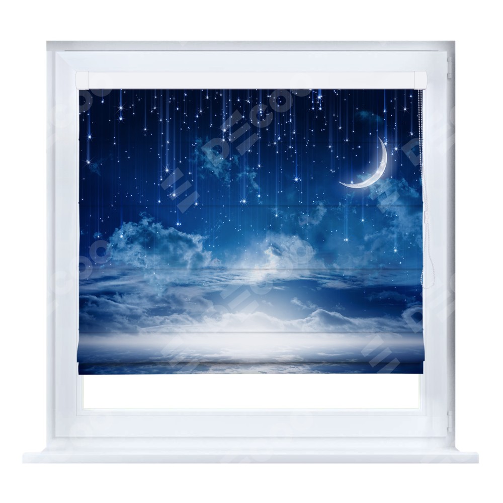 Римская штора кассетного типа, производителя «Cortin», устанавливается только на пластиковые окна и прилегает к стеклопакету, пошита из ткани блэкаут с нанесением сублимационной печати «Ночное небо».