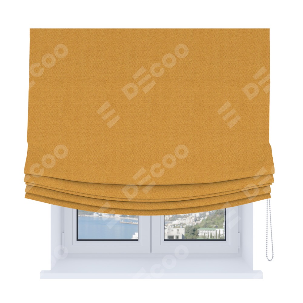 Римская штора Soft производителя «Cortin», используется для проёма, пошита из ткани блэкаут с блеском золотой, артикул ткани 34626. Изнаночная сторона материала черного цвета, что обеспечивает необходимую светонепроницаемость. Имеет универсальный механизм и подходит для монтажа: на потолок, на стену и в нишу. В отличие от стандартных римских штор, римская штора Soft не имеет горизонтальных вставок и нижнего отвеса. Это позволяет ткани произвольно драпироваться в свободные мягкие складки.