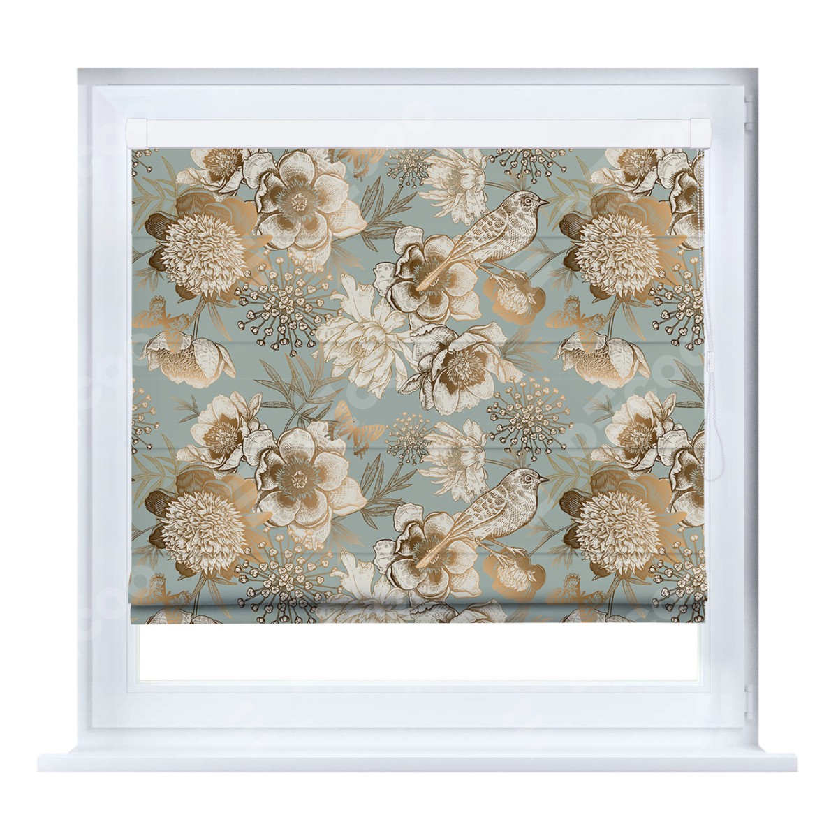 Римская штора кассетного типа, производителя «Cortin», устанавливается только на пластиковые окна и прилегает к стеклопакету, пошита из ткани блэкаут с нанесением сублимационной печати «Садовые цветы».