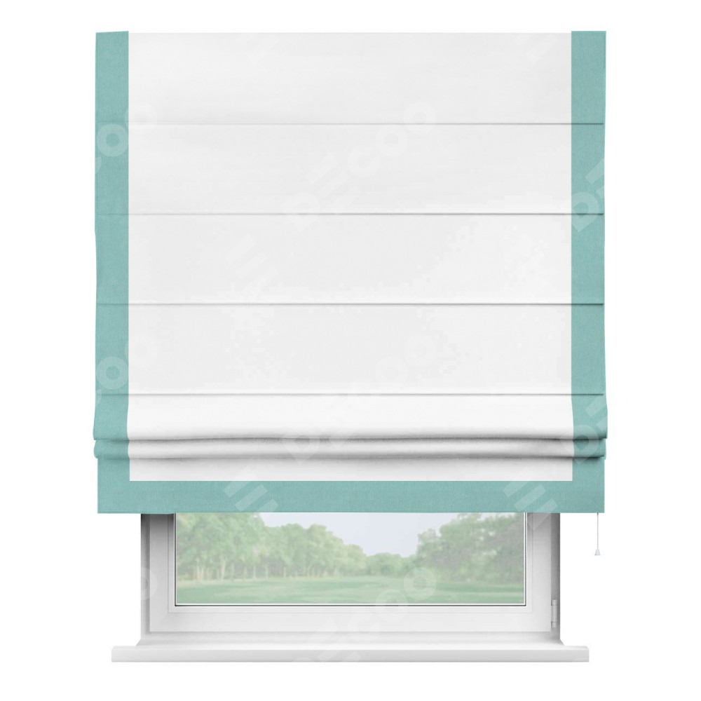 Римская штора производителя «Cortin», используется для проёма, пошита из ткани вельвет белоснежный, артикул ткани 19192. Отделка шторы кантом «Виктория», ткань для канта используется из вельвета разной расцветки на выбор. Имеет универсальный механизм и подходит для монтажа: на потолок, на стену и в нишу.
