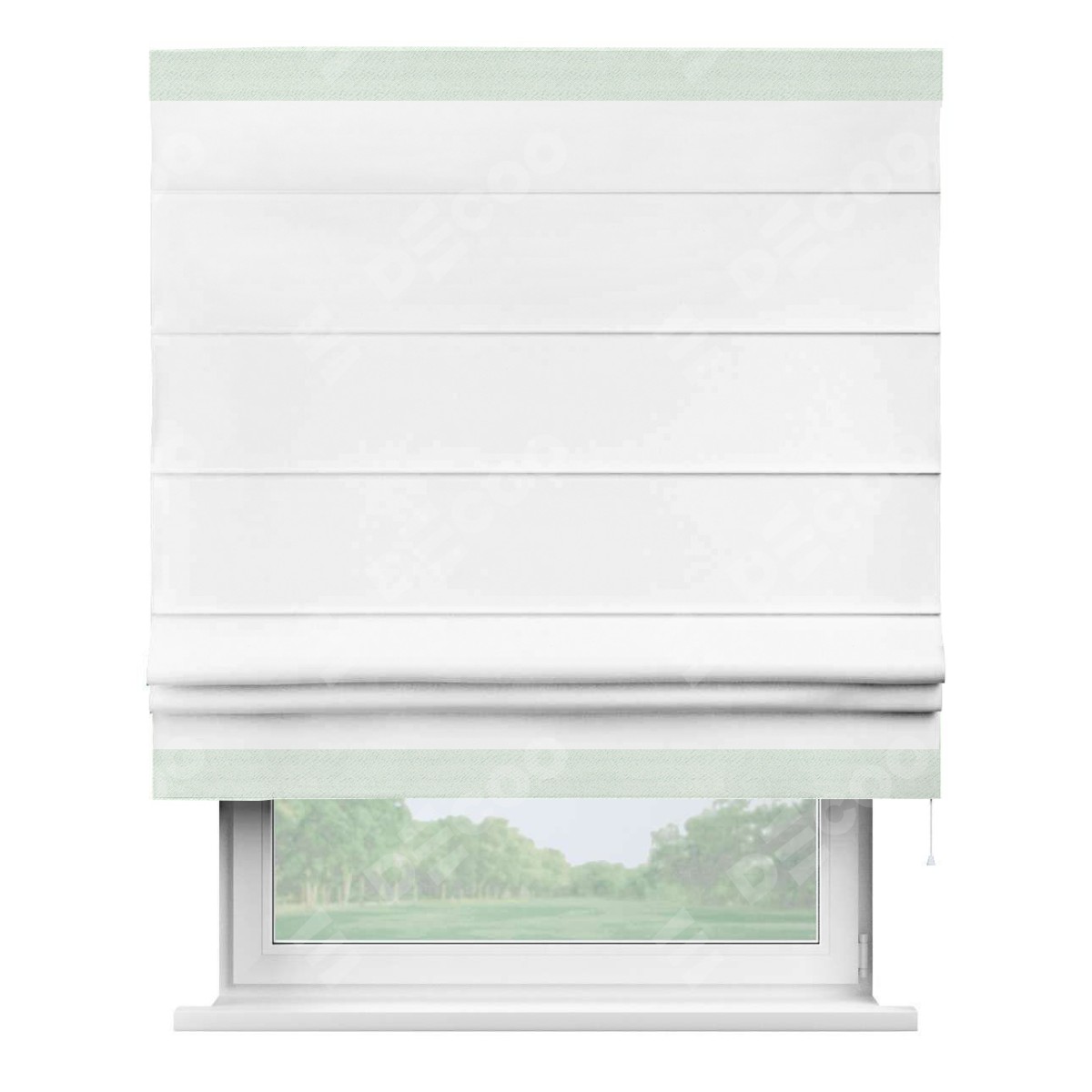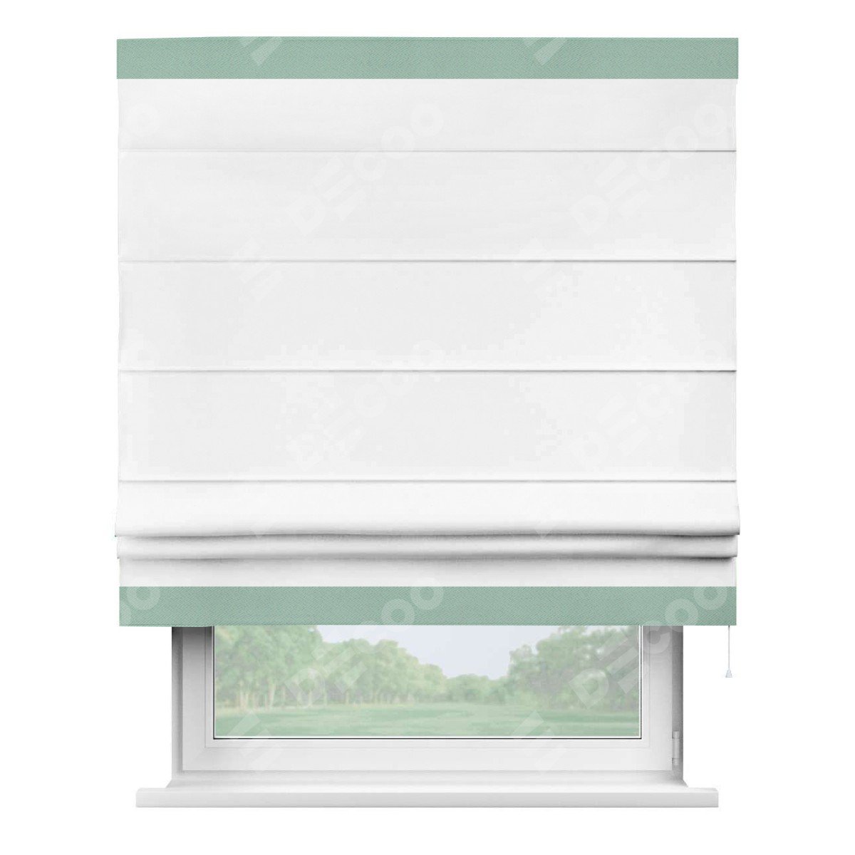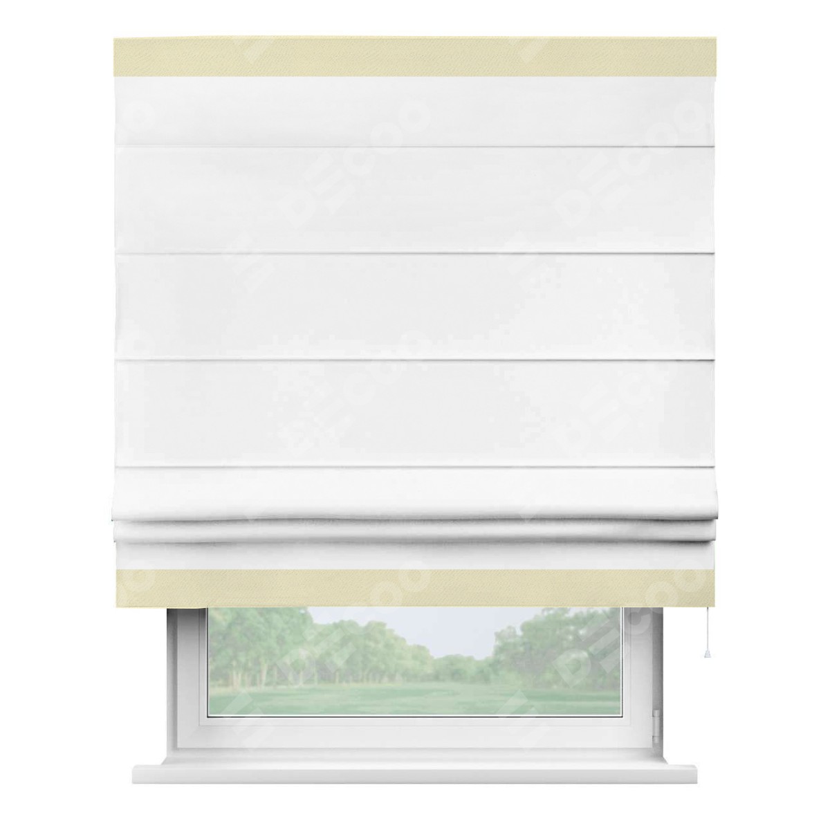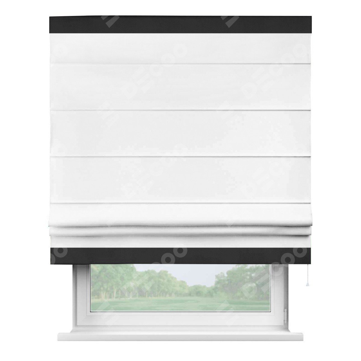 Римская штора производителя «Cortin», используется для проёма, пошита из ткани однотонная белоснежная, артикул ткани 41217. Отделка шторы кантом «Горизонт», ткань для канта используется из блэкаута однотонного разной расцветки на выбор. Имеет универсальный механизм и подходит для монтажа: на потолок, на стену и в нишу.